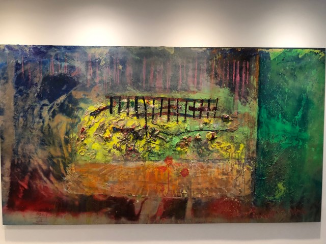 For the next few minutes in the gallery I went round taking photos of some of the paintings – the whole and then details. At each level you can concoct a different story. I’ll take just one example, a painting called Witness, from 2018. It’s more figurative than many of the works, as there’s something in it that could be taken to be a fence. Maybe those are tree trunks in the background – it is set in or inspired by Guyana. The middle detail has a suggestion of bodies just in front of the maybe fence. Or is that just me trying to see something concrete in an abstract flow? Was the witness a witness to a massacre? I’ve no idea. I doubt it. But the word witness, and perhaps my awareness of colonial history, especially while in Bristol, brought that briefly to mind.