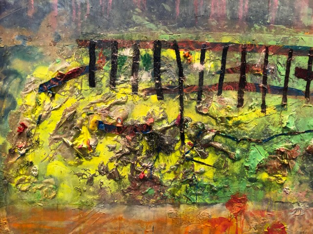 Bowling’s work is vivid, engaging and yes, very abstract. The titles, which are often related to family and memory, get you thinking; but mostly it is down to your imagination. You make what you will of the array of colour, of shapes which emerge and then disappear in the whirl of images that jump from the paintings. There is a variety of paints, materials and found objects splashed across the canvasses. Slashed or sprayed or even poured – the techniques are as various as the materials. Bowling himself has said that his abstract works are more imagination than memory: the idea of a view rather than the view itself*. The use of colour is central in his work. Again, to quote him: colour affects the eye and heart, physically and metaphorically, more directly than any other single element in painting.