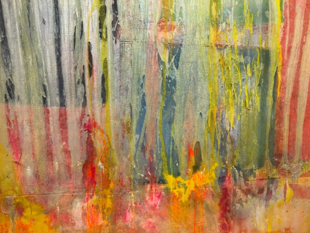 * The two quotes from Frank Bowling are taken from the Arnolfini’s guide to the exhibition – which helped me navigate my zone of uncertainty! The four photos are from paintings in the exhibition – the first I don’t know the title of, but conveys that sense of water and flow and colour, I think. The other three are aspects of the painting Witness, as described in the piece above.