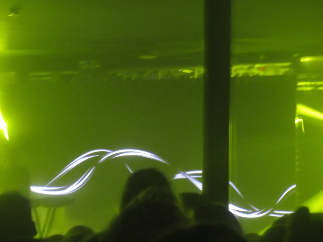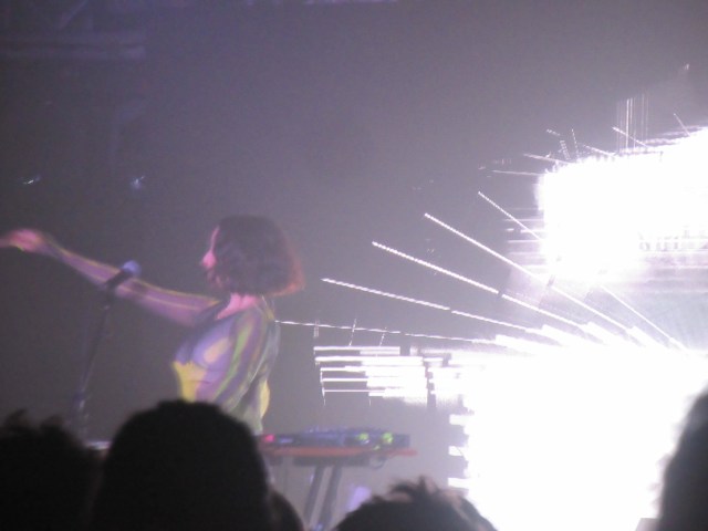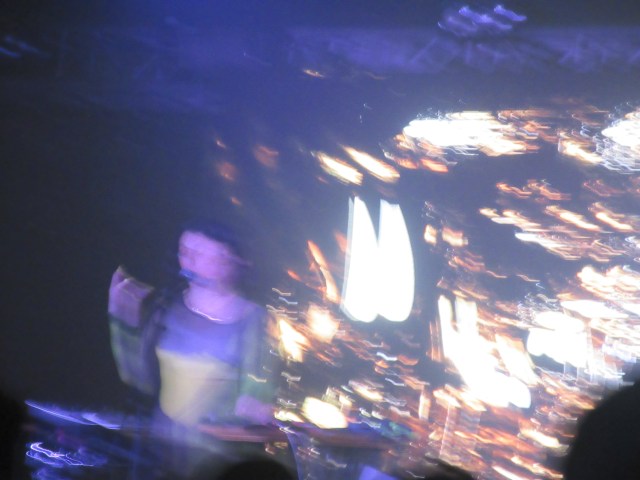 But despite those impediments, what a show it was. About an hour and ten minutes. Paced very nicely, opening with some of the slower pieces, and slowly building to an absolutely thumping climax over the last half hour or so. The show opened with Arpeggi – what else? – and flowed into the lovely Re-Wild, the most explicitly environmental piece on Inner Song. Through the show, we had a nice mix of the two albums, with occasional bursts of those techno beats to keep people on their toes before we went into full overdrive at the end. I guess On marked the point where the beats became relentless. That song is in two parts: a gently anthemic melody at first and then a lurch into jagged electro. The pulsating Night followed that and we were off. Through Jeanette – a tribute to her mother, and a crowd favourite – Evolution* from the first album and then the mighty Melt!, which shook the place to the core, while the flashing lights compounded the assault on our senses. Kelly rocked as she manipulated her keyboards, hair flying around her. The final tune was Kingsize*, which followed Melt! in bludgeoning us into submission – in a good way!