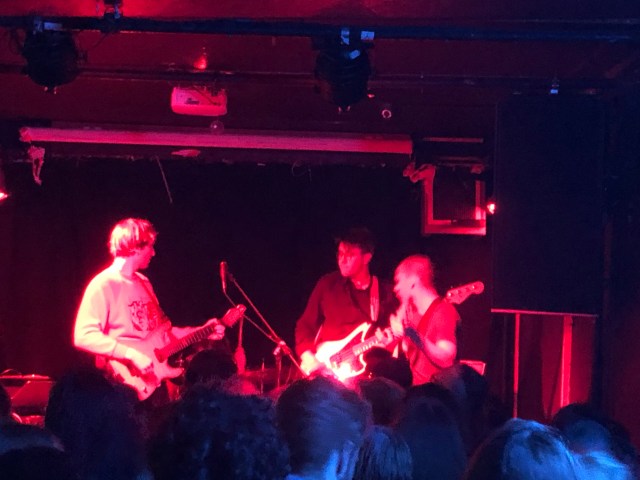 I was greeted with an ironic smile from the security man at the entrance to the pub, and I soon knew why. The ground floor pub was heaving – full of twenty-somethings, wielding cocktails and dancing to Abba’s Dancing Queen at 8.30 in the evening. For me – once I’d wiped the steam from my glasses – it was a vision of hell. Let me out of here! I looked around and saw a doorway leading upstairs, where the concert was happening. I pushed my way through the dancing, chanting throng and headed up to the music room. Relief! A decent space, good ventilation, a bar. Half full at that point – filled out later. People of similar age to downstairs, but totally different. I joked to my son Kieran later that all the misfits, the punks, the students were upstairs – my sort of people! A forty year age gap, but no matter. I got myself a beer and found a good viewing spot near the back. Louis and his friend Gab arrived soon after; Jon would have been there I’m sure, but was on his way home from France. We chatted a bit to Fionn and Tom before the show started – they watched the first band with us.