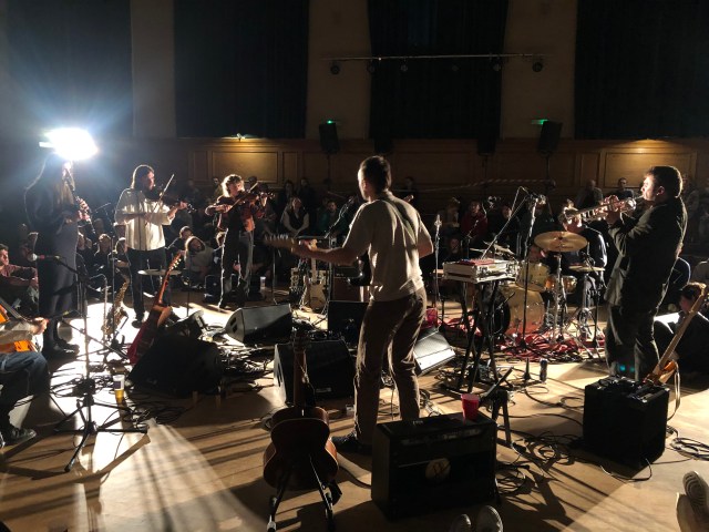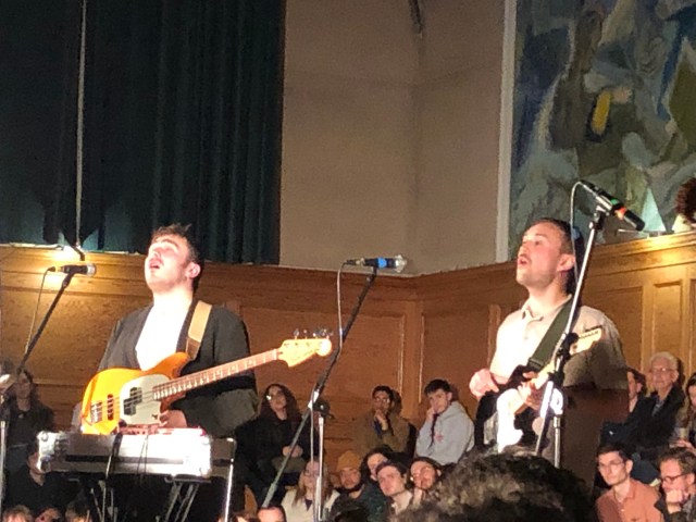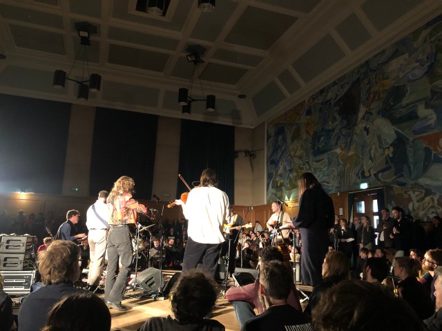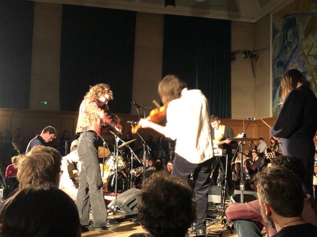 I saw the band at Green Man last year, on the small Rising stage, tucked away in the trees behind the main stage. What struck me then was first, the togetherness of the band; and second, what an enthusiastic following they had. Both those things were evident on Thursday too, though the concert also had a bit of a campfire feel, with the band assembled in a circle, and the crowd – all around – mostly sitting on the hard floor. Mainly young folk too – why weren’t they up on their feet and giving it some? Maybe this is what they thought you are meant to do at a Caroline gig. It reminded me of something I heard on the Word podcast recently, when David Hepworth and Mark Ellen were discussing how a lot of the iconic live shows of bands like Led Zeppelin and the Who in the late 60s and early 70s were in university venues where everyone was sitting on the floor. The Who’s classic Live at Leeds album is one such example. The sitting down was a bit of an issue for me and my friends – Jon G, Shane and Tony tonight – with our creaking limbs and aching backs. (It’s sometimes hard being a gig-goer in your 60s, but it has to be done!) Eventually we made our way to an area near one of the exits where people were standing – and found ourselves a good view too.
