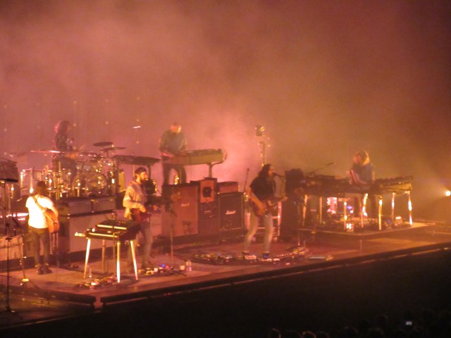 Jon E, not previously a known War on Drugs fan, suggested getting some tickets for the O2 show. And so we were there last Tuesday. For various reasons, including wanting to watch Real Madrid vs Chelsea – a mystery to me, that one – Dave, Tony, Shane, Jon G and Louis all couldn’t come in the end, but Gab did, so we were three. Great seats, quite near to the front, to the left of the stage. The top tier of the O2 was closed and the seats were about two-thirds occupied; but the standing area looked full, and the atmosphere was tingling as the lights went down. The support band, Lo Moon were excellent. Based in LA, with some New York roots, they have a big sound in common with the War on Drugs, but it errs towards Coldplay and an element of shoegaze. I liked it a lot.