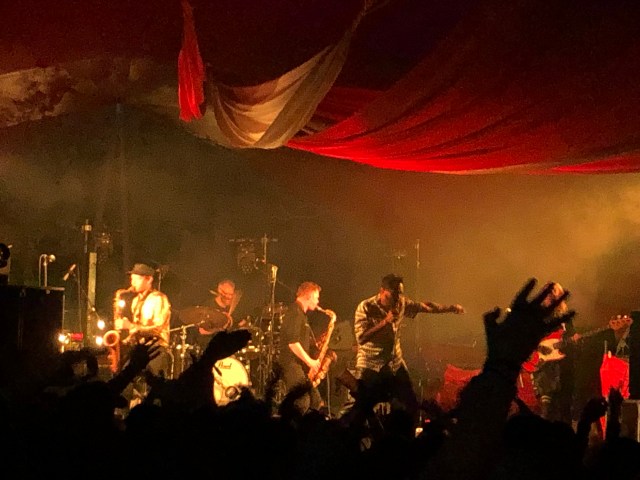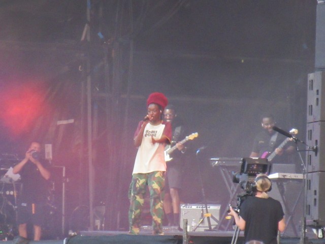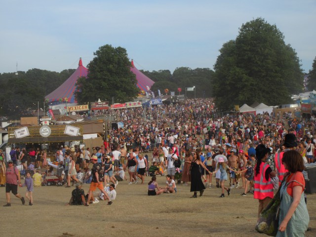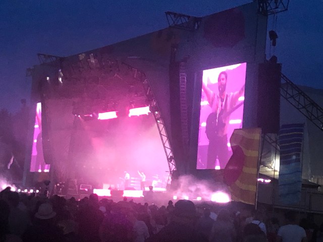 The temperature was in the low 20s on Friday, a welcome contrast to the searing heat of London, which hit an unprecedented 40C on Monday and Tuesday. But it was getting a bit chilly as evening approached, so I took a break and went back to the tent to put on some warmer clothes. That added two miles to my walking tally! Back at the arena, after a very nice Jamaican jerk pork with beans and rice, I caught a bit of Maggie Rogers on the Obelisk stage – nice enough but a bit bland – before heading down to the Sunrise for Melt Yourself Down. They are big favourites of Jon’s, though he missed them for Crack Cloud – even bigger favourites. This was a party, a concoction of thumping beats, pumping saxes and chanted choruses, with a strong African influence. Not much in the way of melodies, but that didn’t really matter as we were exhorted by the singer to clap, dance, punch the air. And the crowd responded to that. It was hot, hot, hot! I particularly liked the way the two saxophonists interacted; the singer I found a bit overbearing after a while. But it was good, high energy stuff.