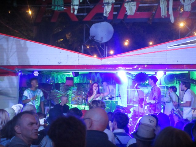 It was through the Woods after that, for our first visit to the Sunrise Arena – always the favourite venue. The band was KEG, one of those bands who will always be described as a bit like Squid. Similar jerky rhythms, scratchy guitars, odd time changes and bursts of trumpet or violin or whatever. Lots going on, and plenty of shouting. A very popular indie sound these days, with a clear debt to the likes of Talking Heads, Gang of Four and XTC. I enjoyed their set, which had real energy and a good dash of humour. They’ve got a song called Kids, which includes the priceless line, Daddy! I want an Itsu. Modern life, eh? Down south, anyway…