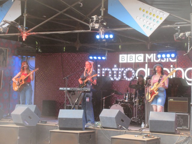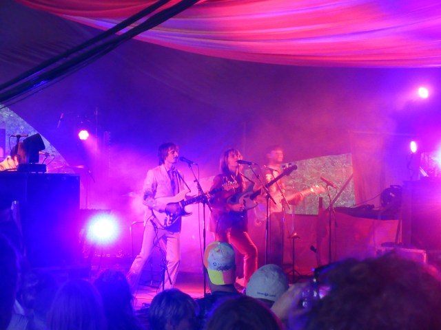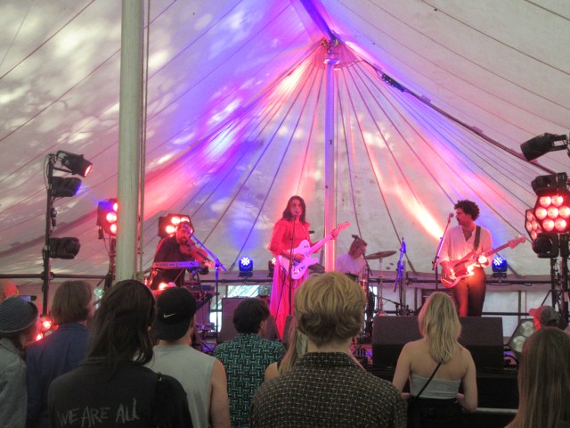 After catching two or three songs by Los Bitchos on the Obelisk, I decided to retreat to the Woods again, this time visiting the Lavish lounge, where the BBC Introducing stage is situated. This is usually a pretty relaxed place – they even have loads of sofas to lounge on. It was very busy this time though. I suspect this was as much the attraction of the shade as the band coming up, though the notes suggested there was a bit of a buzz around them. The band being Lilo, two women, Helen Dixon and Christie Gardener, from Winchester. The music was described as indie folk, as well as slowcore – a new one on me. Anyway, they played a short set of enjoyable, if slight, folkie pop songs which reminded me of the early Staves, though Helen and Christie’s harmonies weren’t quite as spectacular as those of the Watford sisters. A pleasant interlude – except for the dust. The Lavish Lounge won the prize for the dustiest venue at Latitude. It got everywhere (as blowing your nose proved!). It actually made me hesitant about returning there. A bit of straw matting surely wouldn’t have been that expensive.