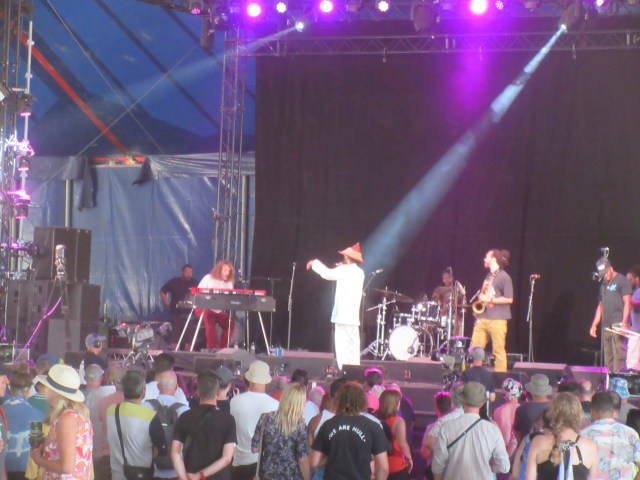 Joe Armon-Jones is a great keyboard player, featuring in recent times with Ezra Collective and Nubya Garcia. He makes his own music too, but is a reluctant frontman, as he told us more than once during his show. There was more of a reggae element to today’s set than what he has been doing with the aforementioned jazz bands, and much as I love reggae, I like his jazzy side better. There was plenty of that in the second half of the show, and it was a great set to chill out to – metaphorically, as the tent was heating up a bit. Jon, Gab and Louis all took the opportunity to lie down and get some shut-eye – wish I’d taken a photo! An enjoyably soporific 45 minutes.
