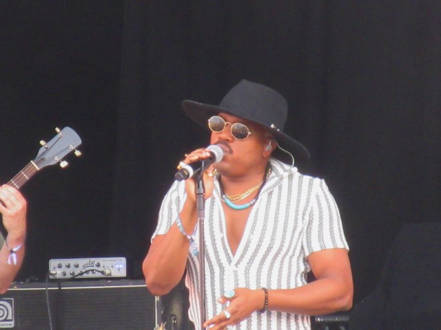 Back down to the Woods stage next for one of the highlights of the festival – the sweet, slinky soul of Durand Jones and the Indications. They’ve changed a little since I first saw them at Latitude in 2018, when they had a very cool horn section, and a bit more of a 60s feel than now. It’s full-on 70s soul and funk now, and it is so good! The vocal duties are split between Durand Jones, who does a very good Marvin Gaye – think Let’s Get It On – and the drummer Aaron Frazer, whose falsetto takes you straight back to the likes of George McCrae and the Chi-Lites and, come to think of it, Smokey Robinson. It’s pure joy as every song unfurls – I particularly liked one of the slower ones called Is It Any Wonder? I think the crowd, which was a good size, felt the same way. Just about everyone was moving to the groove. It’s irresistible! This is a band to put a smile on your face and feel the love.