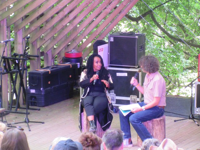I got down to the Talking Heads stage to catch the second half of the author Tom Cox’s talk. He has just published his first work of fiction, Villager, which synthesises his passion for music, nature and folklore. I liked his description of his writing process – lots of “faffing”, mulling over ideas; and then once he starts writing, it happens quickly. I can relate to that. He was followed by singer PP Arnold, who was a real force of nature. She was interviewed by author and music journalist Will Hodgkinson – he could hardly get a word in! Pat (as she referred to herself) married young and was in an abusive relationship in Texas. But providence came her way and she got a chance to audition as a backing singer for Ike and Tina Turner. It kicked off from there. Ike and Tina supported the Rolling Stones on tour in the UK in 1966, and she quit after that to pursue a solo career in the UK, encouraged by Mick Jagger, with whom she had a relationship. Her solo efforts never really took off, but over the years she sang with all sorts of stars, including the Small Faces in the 60s, Eric Clapton and Roger Waters. She also appeared in various musicals. She made some recordings with Barry Gibb of the Bee Gees in the 60s and 70s, which she was finally able to release in 2017. After moving between the UK and Los Angeles, she settled in this country. She was such a great talker that she didn’t get much past the Stones and Immediate Records days in the 60s, but it was a joy to listen to her. She has recently published an autobiography called Soul Survivor, which I think I’ll have to get. And at the end of the talk, something happened that I haven’t seen at the literature events before – just about everyone stood up to applaud and cheer. Great stuff!