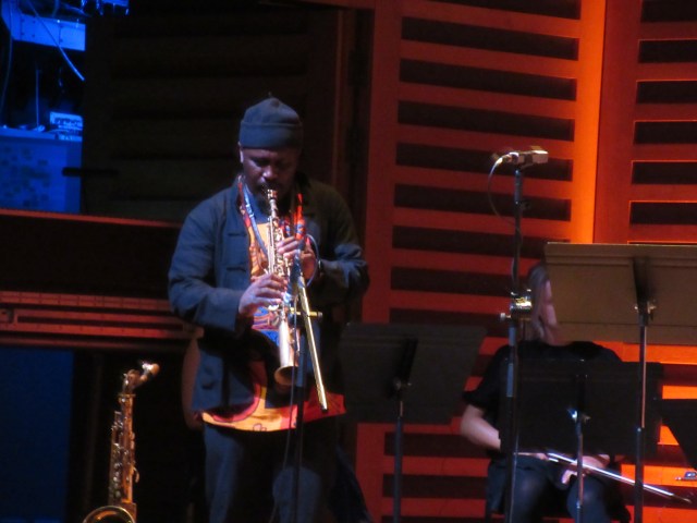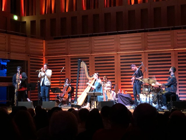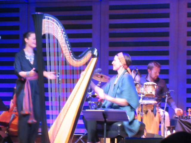 On the more upbeat numbers the harp mostly played a supporting role – its subtle variations were at times upstaged by the drums and bass, or the soaring sounds of the sax and trumpet. Alina played a few solos of course, and it was always fascinating to watch her fingers move across the strings even when you couldn’t fully hear the sounds coming from them. But on the slower tunes, notably John Coltrane’s “Alabama” – a lament for the people of that state who were killed during the struggle for civil rights in America – the instrument really came to the fore, weaving its magical spells. The interplay with Tony Kofi’s soprano sax on that song was a thing of great beauty. It was the last tune before the interval; just before it came another Coltrane song, “Afro Blue”, with vocals from the Scottish jazz singer Niki King and some drum pyrotechnics from Adam Texeira. Towards the end of the show we reached one of my favourites, Paris sur le Toit, which has something of a hip hop beat, and definitely a feel of that great city. Alina described how she’d written the song on the Eurostar, on the way back from Paris. I think it was the first song of hers that I’d heard, on that Cerys Matthews show. There are two versions of the tune on the album, one with a jazz-rap vocal – partly in French.