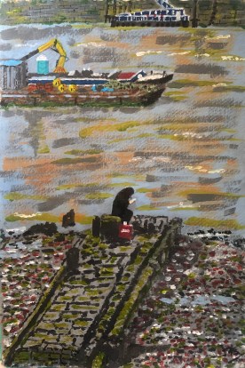 Maybe that’s why the woman in this next photo chose such an unusual place to sit and have a look at her phone (in March 2019). Maybe she was waiting for someone. Maybe she was a friend of the guy doing the digging. Or maybe it was just the sense of freedom, and the restless sounds of the river. I painted a picture of the scene, which I called Girl with Phone. (Took an artistic decision to leave the guy out!)