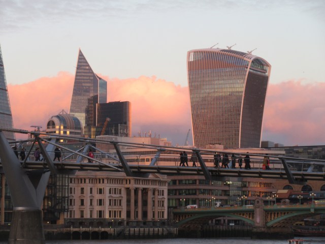 I’ll come back to the City in the next instalment of this journey, but let’s continue now to the Tate Modern and the nearby Millennium Bridge. Two more icons of modern London. The Tate Modern houses one of the world’s largest collections of modern and contemporary art. It officially opened in May 2000. The Bankside power station had closed in 1981 and was at risk of being pulled down. It’s a striking building from the outside; but inside it is a marvel. The huge Turbine Hall, which occupies the central space is an awesome site, cathedral-like. It has been used over the years for some mind-boggling exhibitions. The two that stand out in my memory are Ai Weiwei’s Sunflower Seeds in 2008 and Olafur Eliasson’s extraordinary Weather Project in 2004, in which a large sun-like object radiated yellow light through the hall, reflecting off the large mirror covering the ceiling. We all lay on the floor to take it in – and see ourselves reflected in the throng. At that moment you understood why ancient civilisations worshipped the sun.