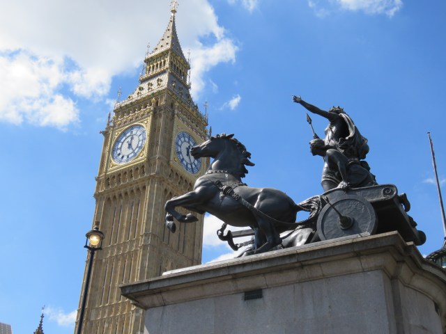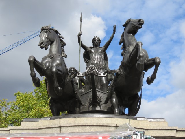 By Westminster Bridge stands the statue of Boadicea (or Boudicca) and her daughters on a chariot, ready to resist the Roman invaders no doubt. It’s the work of the Victorian artist and engineer Thomas Thorneycroft. It was placed in its present position in 1902. Despite its grandeur it’s quite easy to miss in the tourist throng around the bridge.