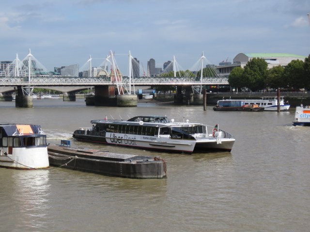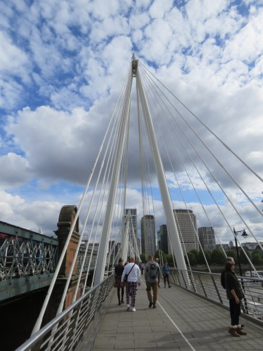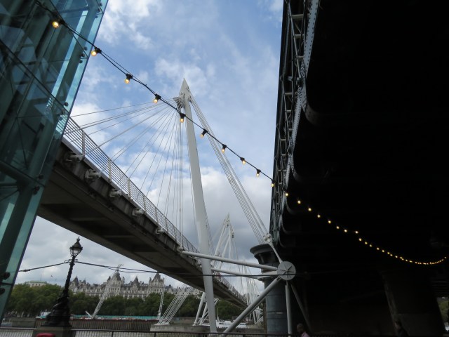 Monuments over, let’s double back to Hungerford Bridge, on which the railway from Charing Cross crosses over the river – first stop Waterloo station. On both sides of the railway bridge there are walkways which afford wonderful views of the river, upstream and downstream. Until I started doing some research for this piece, I’d completely forgotten that these walkways were only opened in 2002, for the Queen’s Golden Jubilee. There was something before that – just a narrow path on one side. The original Hungerford footbridge, designed by Brunel, opened in 1845. It was named after Hungerford Market in Charing Cross, on the site that is now the station. It was replaced by a railway bridge in 1864, to connect the new Charing Cross station with the rail network south of the river. Parts of the original suspension bridge were used in the construction of Clifton Suspension Bridge in Bristol. The rail bridge did initially have walkways on either side, but over the years one or other was closed as the rail bridge was widened and refurbished. A happy balance between trains and pedestrians now exists.