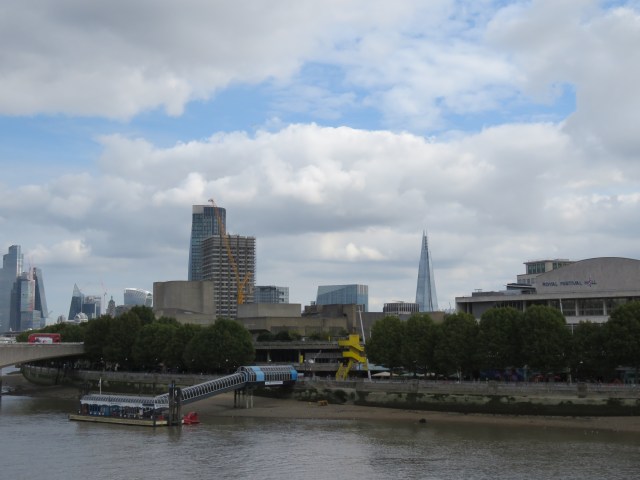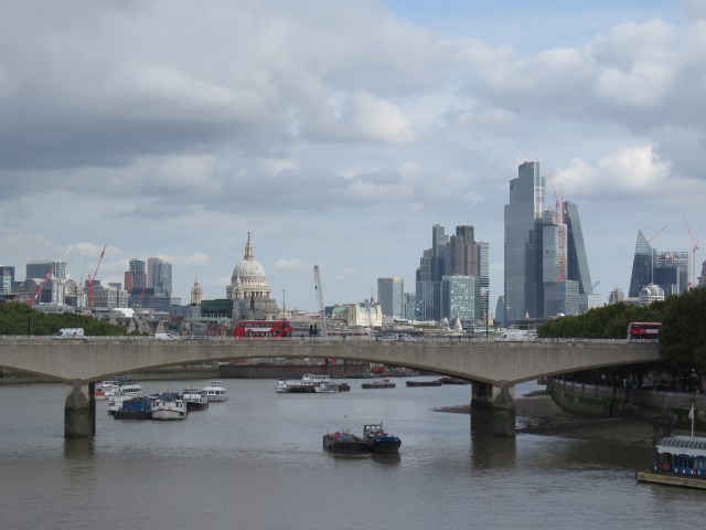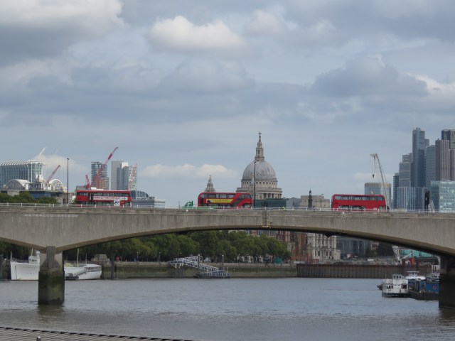 The bridge takes you from Embankment station to the South Bank, and one of the great arts and entertainment complexes to be found anywhere, a jewel in London’s crown. The 60s brutalist buildings may not be to everyone’s taste, but within they are home to music, art, drama, cinema, you name it. The Royal Festival Hall (including the Queen Elizabeth Hall and Purcell Room), the Hayward Gallery, and beyond Waterloo Bridge, The National Theatre and the British Film Institute. Not to forget the skateboarders arena! The whole area along the river is pedestrianised; there are bars and stalls restaurants all around, a food market behind the Festival Hall, second hand booksellers under the bridge. A place where Londoners and its many visitors can promenade. And all the while the river rolls by, conducting its business in the background. One of my favourite parts of London? Of course it is!