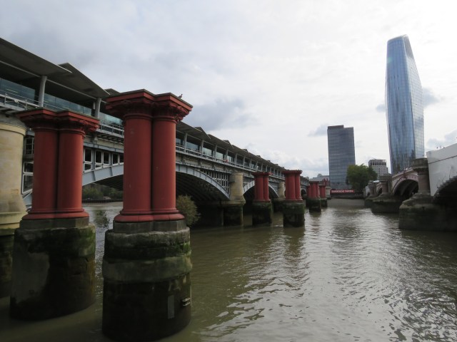 Blackfriars railway bridge is close by. It now has a Thameslink station on it. Running alongside are some red pillars. They belong to the old bridge, opened in 1884, which carried the London, Chatham and Dover Railway.