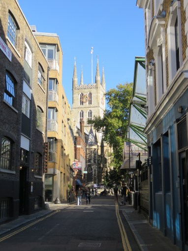 Approaching Borough Market on right – and Southwark Cathedral ahead