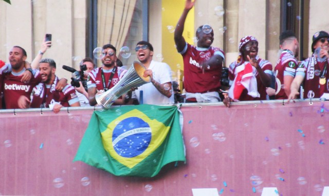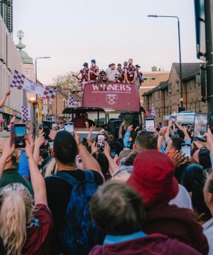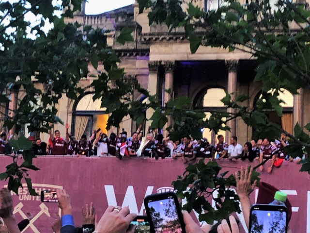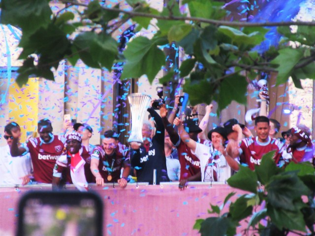 I was still feeling elated the next morning, when I received a text from the club about a victory parade that evening. Thursday. Starting near the old Boleyn Ground in Upton Park, by the statue of Moore, Hurst and Peters – West Ham 4 West Germany 2 – and proceeding to Stratford Town Hall. I had to go. The bus was leaving Upton Park at seven. I figured it might take half an hour to get to Stratford, so best to try to get there myself by around 6.30.  I took the Elizabeth Line – do we not love it? – from Ealing Broadway to Stratford and joined all the fans walking through Stratford shopping centre to the town hall. They were singing the song that became the evening’s mantra: West Ham are massive, everywhere we go! At first it sounded moronic; later, I couldn’t get it out of my head!