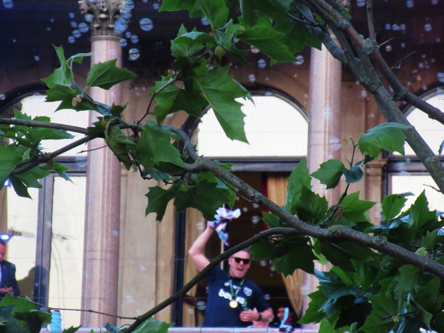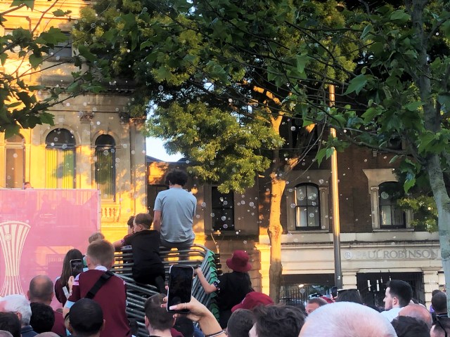 I found a decent position opposite the Town Hall, near some trees. The streets were heaving with claret and blue. I had my retro shirt on – Cup Final 1975 (we beat Fulham 2-0). Young lads were sitting on the roof of the bus shelter, little ones were on their parents’ shoulders. All ages were there. There was a carnival atmosphere – incredibly good-natured. A DJ played popular tunes. There were rounds of I’m Forever Blowing Bubbles of course, plus paeans to Jarrod Bowen (a euro-disco thing), Said Benrahma (White Stripes’ Seven Nation Army) and Lucas Paqueta (I didn’t recognise that one). And West Ham are massive, everywhere we go! Sweet Caroline got an airing of course, as did Spandau Ballet’s Gold, poignant with the passing of chairman David Gold a while back.
