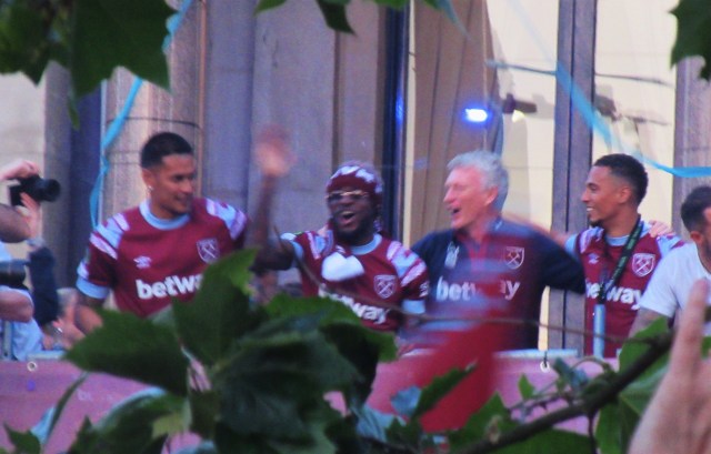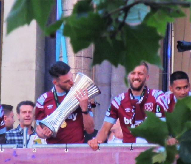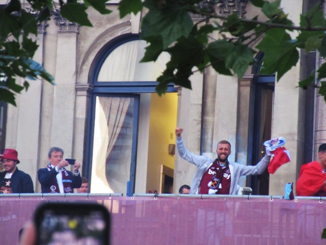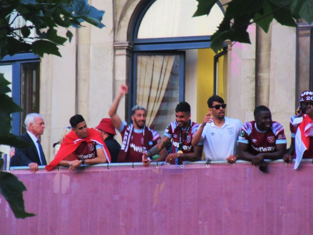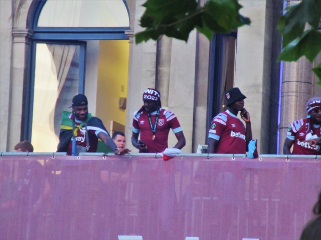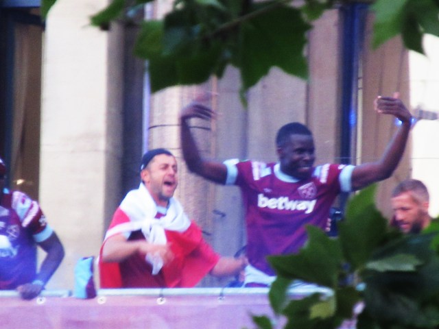 The mayor and chief executive of Newham were interviewed on the balcony and were respectfully received. The chief exec was a big Irons fan. The MC said the bus was due at eight. That deadline passed and he said another fifteen minutes. People were getting a bit restless, but kept up their spirits, singing along to the repeated tunes. 8.30 – my feet were hurting! 8.45: the team finally started to appear on the balcony, the first being coach Kevin Nolan, who gave it some. And then they were all there, and the party started. All the same tunes as before, with the squad bouncing up and down with the crowd, loving every moment. The Cup appeared, with Dec I think, and got passed around after that. Pablo Fornals was passionate, Lucas Paqueta did some nifty dance moves and produced a Brazilian flag, Kurt Zouma was bigging it up, Thilo Kehrer led some singing, Dec caressed the cup and everyone just rocked! It was joyous to behold. There were brief interviews with Jarrod Bowen, Dec, Moyesey and Mr West Ham, Mark Noble; but mostly, everyone just danced.