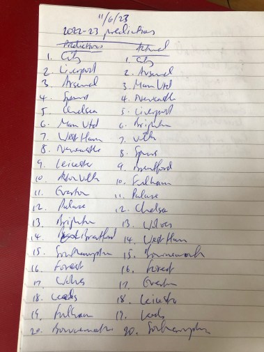 So here are my predictions, with the outcomes in brackets. I only got two spot on: Man City as champions, which hardly took much foresight; and Nottingham Forest in 16th. That’s random; but at least I was right in predicting they wouldn’t be relegated, which a lot of pundits thought was likely.