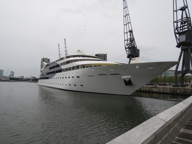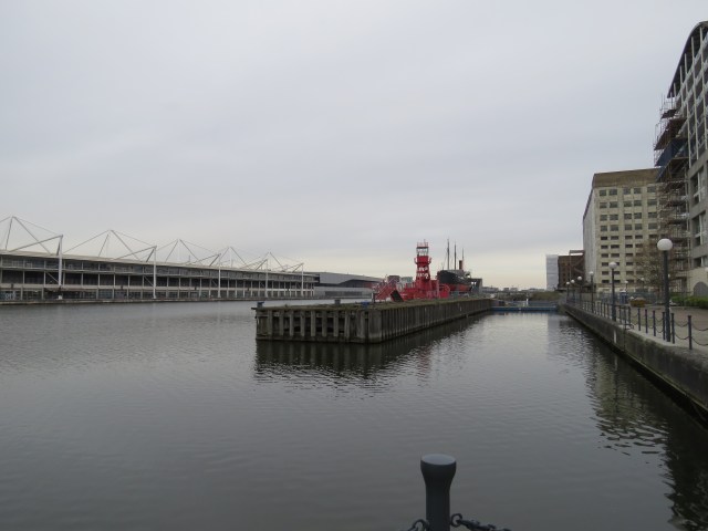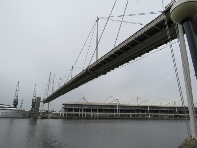 I went down there, armed with camera for you dear readers, in April this year. I took the DLR to George V and ventured into North Woolwich. It was pretty bleak and I couldn’t walk into the George V dock from the Thames as the channel was cut off by barbed wire. So I walked upstream until I reached Thames Barrier Park. I’ll come back to the Thames Barrier when we are on the south side. From there I walked through a new apartment development called Royal Wharf to Victoria Dock. There’s a spectacular footbridge over the dock to the ExCel. It’s pretty high up and has quite low barriers on the sides, which meant I got the wobbles a bit and felt impelled to stay in the middle. So my photos weren’t taken from the best vantage points.