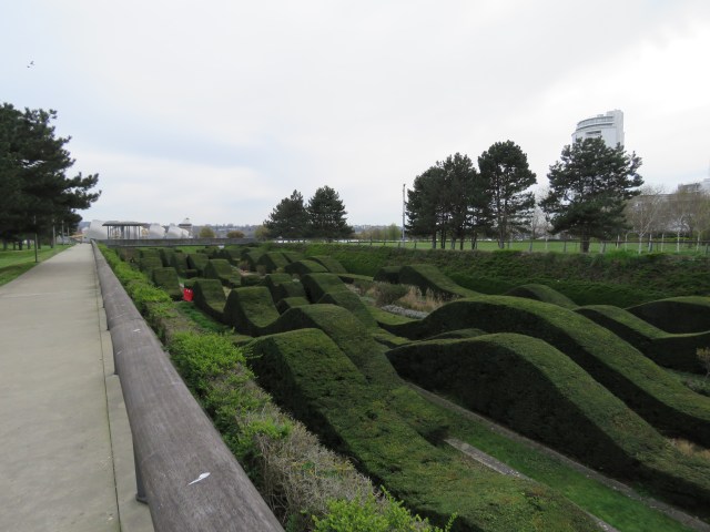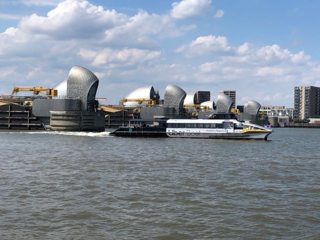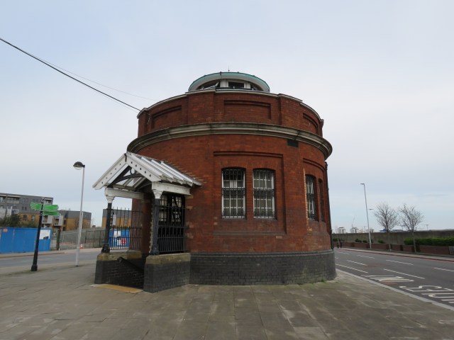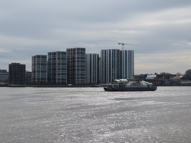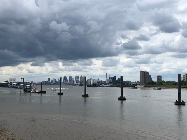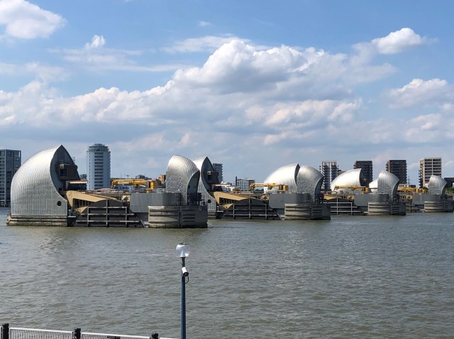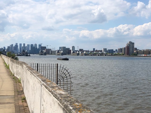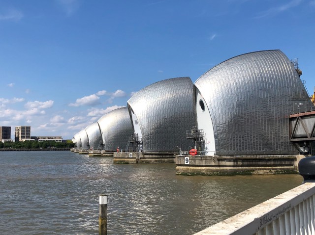 We now go back to the south side. And the first notable landmark – very notable – is the Thames Barrier. This is what prevents central London from flooding at high tide, which it used to do in the past. The barrier began operation in 1982. Worryingly, it starts to become less effective from 2030 and will need to be reinforced before 2070. That might not take into account the rapidly rising sea levels because of global warming. But for the time being it remains a marvel of engineering. When necessary, the barriers rise from under the surface at very high tides. Generally it’s less than 10 a year, though in 2013-14 it was 50.