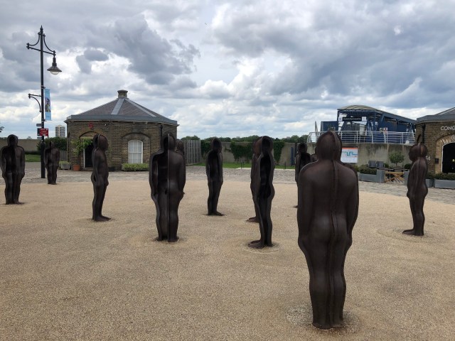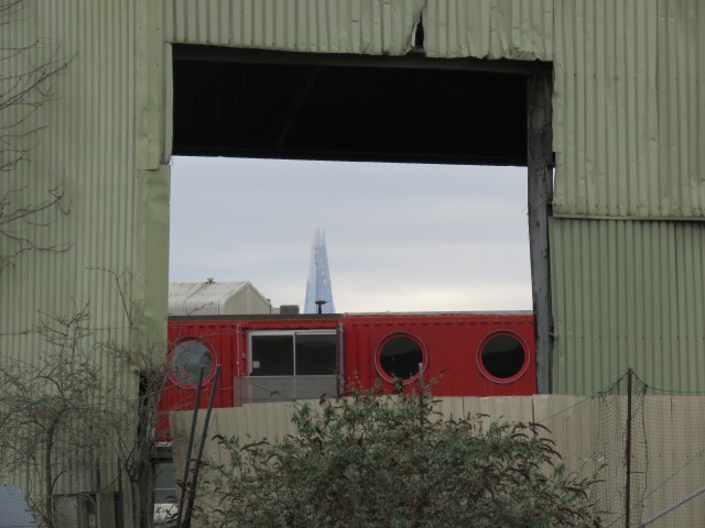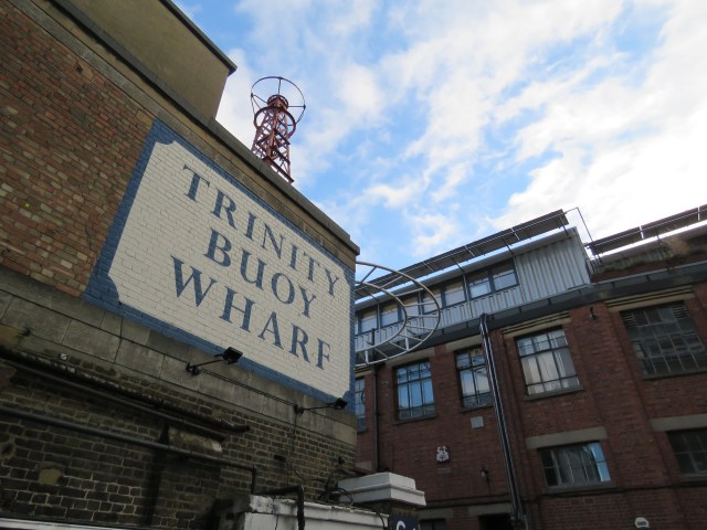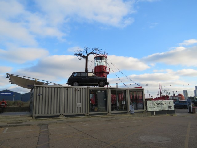 Trinity Buoy Wharf is an intriguing place. In the days of the docks there were lots of warehouses, as well as a lighthouse, which remains. Today it’s a centre for the arts as well as the site of a primary school and residential blocks. And it’s where the River Lea flows into the Thames. By the confluence is a square called Orchard Place. There are buildings made from shipping containers and a café with a black London taxi on the roof!