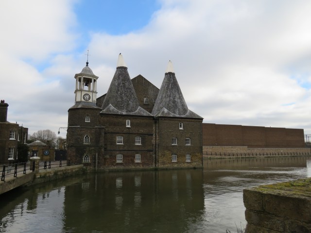 From Cody Dock the walk up to Three Mills is past Amazon warehouses and unfinished building works, with reeds massed by the edge of the river. You cross over a road bridge and then follow a path along a causeway with the river either side. It’s also where a canal known as Limehouse Cut heads off to Limehouse Basin. And then you arrive at Three Mills. Nearest tube station Bromley-by-Bow, on the District Line. It’s an extraordinary place to find in the middle of East London, When I first came across it reminded me of Bruges in Belgium. I remember similar architecture along the canal there. The original mills date from Norman times; today’s buildings were mainly constructed in the 18th century. Some of the complex is now TV and film studios. The BBC’s Master Chef is filmed there.