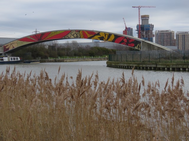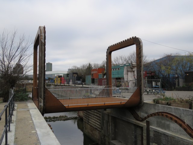 From Trinity Buoy Wharf you wander along the Lea – also known as Bow Creek in these lower reaches – to London City Island, a new residential development, which is also the headquarters of the English National Ballet. It’s then worth crossing over the River Lea to Canning Town station and taking the DLR one stop in the direction of Stratford to Star Lane. Otherwise the walk is just through an industrial estate. From Star Lane you walk down to Cody Dock by the Lea. There’s an interesting revolving bridge there, as well as a little nature reserve and various studios and offices. It’s still being developed, but there’s a café and lots of tables by the river. A rather serene place to have your sandwich and a cup of tea.