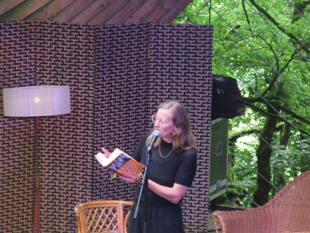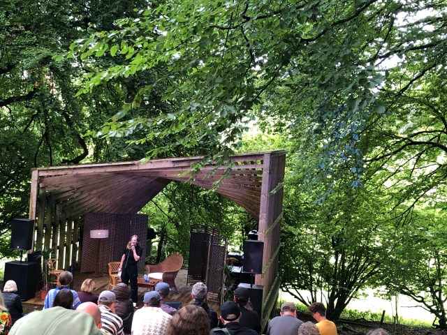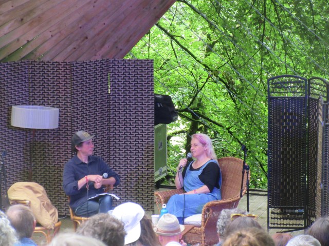 Jon and I went to all three of the book talks down at the Talking Heads stage today. It’s a beautiful setting amid the trees, with the Dorset hills in the background. The straw bales were still a bit damp, but I had a plastic bag with me, which prevented wet bum syndrome! First up was scientist and nature writer Amy-Jane Beer who published a book about rivers called The Flow last year. As a bit of river obsessive myself, I enjoyed the talk, though there was rather a lot about kayaking. Next was Harriet Gibsone, music writer, Guardian journalist and now a freelancer. She’s written a memoir called Is it OK? which delves into her relationship with the internet, her obsessions – which include Coldplay singer Chris Martin! – and grappling with depression, the menopause and motherhood. Sounds heavy, but she was actually very funny and incredibly candid. A very engaging interview. Finally Emma Warren, a music journalist specialising in the dance genre – she’s also a DJ – talked about her recent book Dance Your Way Home; A Journey through the Dancefloor. She did it without an interviewer, which was a mistake, as she lost the benefit of interaction; but her passion for all things dance, including kitchen moves and school discos, came through strongly. I liked the way she talked about dancing your history and your story (which she distinguished). In fact, later in the day, as a woman in front of me at Angel Olsen danced a peculiar dance, all hand movements, I thought, she’s dancing her history – or maybe it was her story.