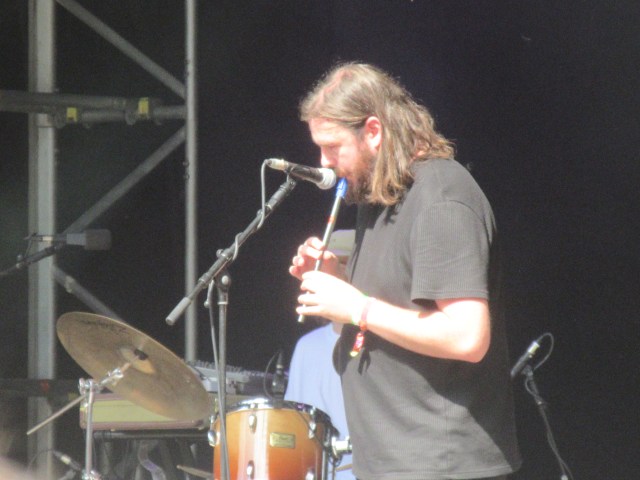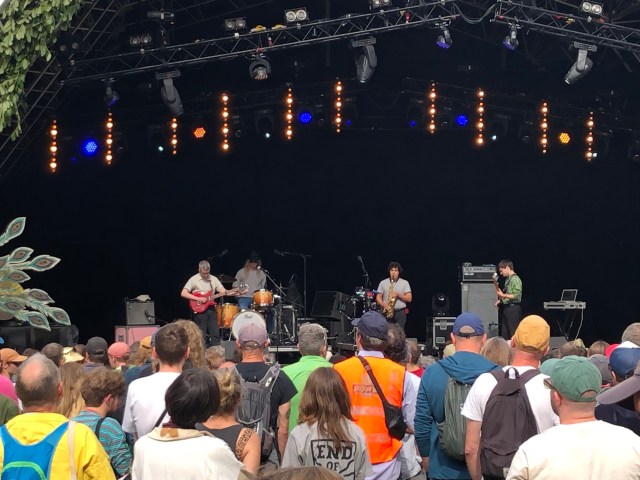 After a brief excursion to Ursa Major Moving Group (one person!) in the Folly, which was not for us, the first music of the day was American band Say She She. If you enjoy the recreation of the 70s disco and soul sound, this band could be for you. The crowd were soon dancing. I enjoyed it for about 20 minutes then got a little bored. Next up, on the Garden stage were Horse Lords. I’d been intrigued by the track Zero Degree Machine on the playlist, which combined some African-style guitar with a crunching beat and strident sax. The show had all those things and more. It was avant garde jazz meets math rock, pretty intense. Played by geeky-looking bunch of Americans from Baltimore. Intriguing – further exploration required.