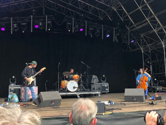 I skipped the literature talks today, had a leisurely breakfast, read a bit and wrote up some notes in the sunshine. So the first thing today was Mabe Fratti and her band on the Garden stage. Mabe is a cellist and singer. She’s Guatemalan, based in Mexico. She came to my attention in 2021, with her extraordinary album Sera Que Ahora Podremos Entendernos? Translated that’s Will We Be Able to Understand Each Other Now? It combined wildness and beauty in equal measure, and the sounds she generated from her cello were remarkable. Kath and I saw her live at King’s Place in 2022 in a captivating show. That one had moved on from the music of the first album, but today she returned to it. And it was awe-inspiring. Together (I think) with guitarist Hector Tosta – with whom she’s about to release an album, Vidrio, under the name of Titanic – she created a beautifully atmospheric soundscape, even under the blazing sun. Over that her vocals wafted, while the drummer added an unobtrusive but sympathetic beat. I was truly engrossed, and I could see that others around me were too. A festival highlight, for sure.
