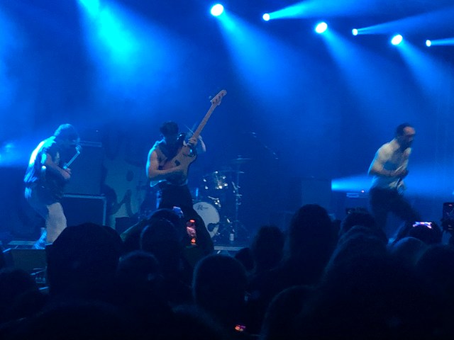We then had the sequence of slower but no less dramatic songs, featuring for the first time that I have seen, the brilliant Slowdance I and II: the latter a searing instrumental, which they reworked considerably from the recorded version tonight. It involved the band forming a huddle at one point, as the guitars thrashed. Things then started to build to the climax with a scintillating For Everything. Our appetites truly whetted, it was time for the energy rush of the final three: Feeling Fades, Ethel, Don’t Cling to Life. Anthemic, chaotic, exhilarating. The band and crowd lit in deep blue. Truly, truly sensational.