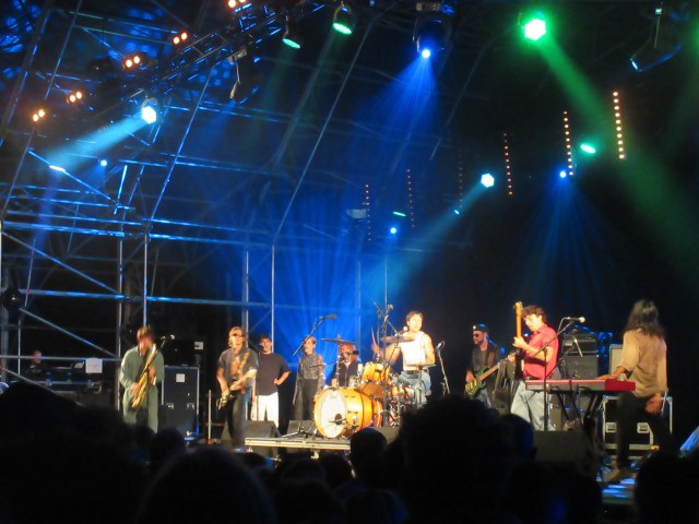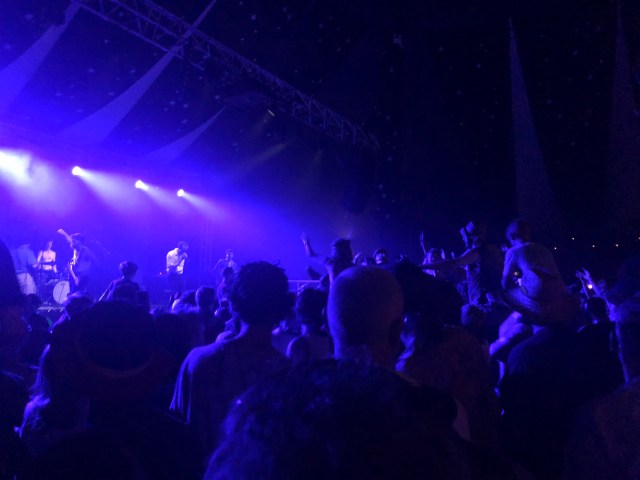 After the intensity and energy of the three Garden shows, I felt like something a little more relaxing, and wandered down to the Talking Heads stage for Sessa, a Brazilian guitarist and singer. He played a set of gentle ballads on his acoustic guitar in a kind of bossa nova style. He was accompanied by a backing vocalist, Paloma, who added to the dreamy effect. And all this in the gorgeous setting of the Talking Heads stage, with the trees lit up in reds and blues. Truly, my soul was soothed.