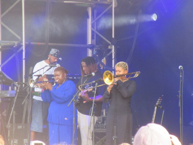 After a break back at the tent, we returned to Kokoroko on the main stage. The perfect band for a sunny afternoon. Joyous sounds melding jazz funk, salsa, Afro-beats. The trumpet and trombone to the fore, embellished by funky guitar and insistent drum and bass. One or two punchy guitar solos added to the mix. The crowd responded in the only way they could – with a lot of dancing. Kokoroko know how to make you feel good!