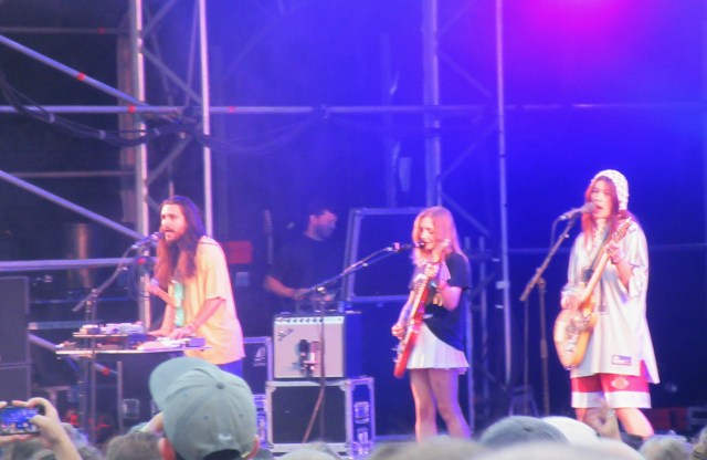 We caught a little bit of Divorce on the main stage – surprising countryish – and then tried Madmadmad in the Big Top. The playlist track Gwarn gave me Talking Heads vibes, which is always a good thing. Live the three of them, armed with an array of keyboards and effects, pounded out some hard-rocking dance beats, embellished in one song by a raging guitar. An in-yer-face sound, which I enjoyed for a few songs, before I started to feel I’d heard enough and could do with something a bit more soothing.