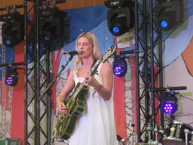 That set me up nicely for another Aussie singer-songwriter: my favourite of the moment, Indigo Sparke. Her 2022 album Hysteria was my album of the year; its predecessor, Echo, made No2 in 2021. I find her songs captivating, subtly moving. There’s a real beauty – and sadness – in her voice. She does have a band back in the US where she is based, but once again – I’ve seen her twice recently – she was solo, except for the last song where a friend accompanied her on vocals. She played a familiar mix of songs from her two albums, plucking a rather splendid green acoustic-electric guitar. She had the crowd entranced – no talking during the songs for this one. I found myself almost in a dream-like state; but that ended abruptly when she announced that she’d come to her last song, a Cat Power cover. Up to that point she’d only played half an hour. After that last song she could have played a couple more; but in fairness it was very hot and maybe that was as much as she could manage. A case of quality rather than quantity today, and I really would like to see her with a band sometime.