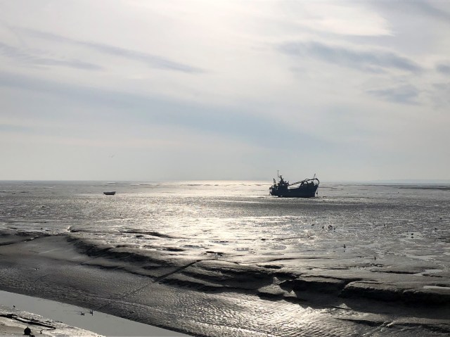 We got off at Leigh and headed down to the estuary. The tide was out, to reveal glistening mudflats in the sun, dotted with stranded boats, silhouetted when you looked in the direction of the sun. On the shore below us were rows of cockle sheds – they are farmed round here. I think oysters are too – they were certainly prominent in the restaurants and bars which lined the cobbled seafront street. Very tempting to stop for a snack, but we had a lunchtime booking in Southend. Leigh used to be a fishing port, and it looked as if there is still some activity, but the port silted up a long time ago. It has reinvented itself as a resort and culinary centre.