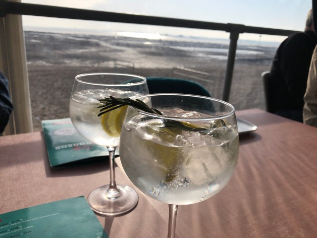 We had half an hour to spare before lunch so we popped into a big pub called the Castle Hotel, which was ornate and packed with snooker/pool tables and dartboards as a seaside pub should be. And then it was time for Billy Hundred’s. It’s just a small beach café, but the food and service was outstanding and very reasonably-priced. We started with some large Leigh Shore G&Ts and shared a couple of bottles of a fresh Verdejo. To eat we had a range of seafood and vegetable dishes, all done in interesting ways. With sides of chips of course – it was the seaside. The sun blazed through the plastic sheeting, making it feel like summer. An unexpected treat.
