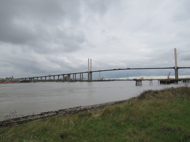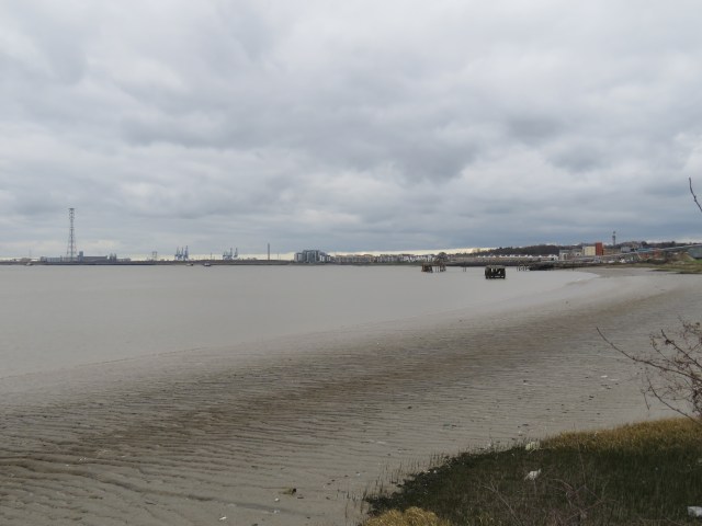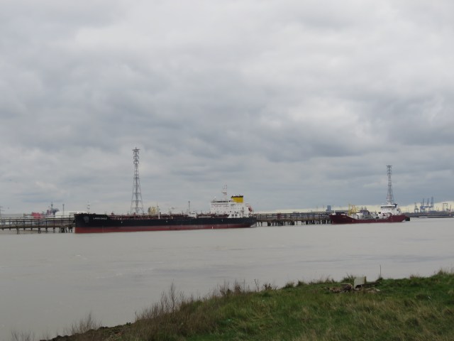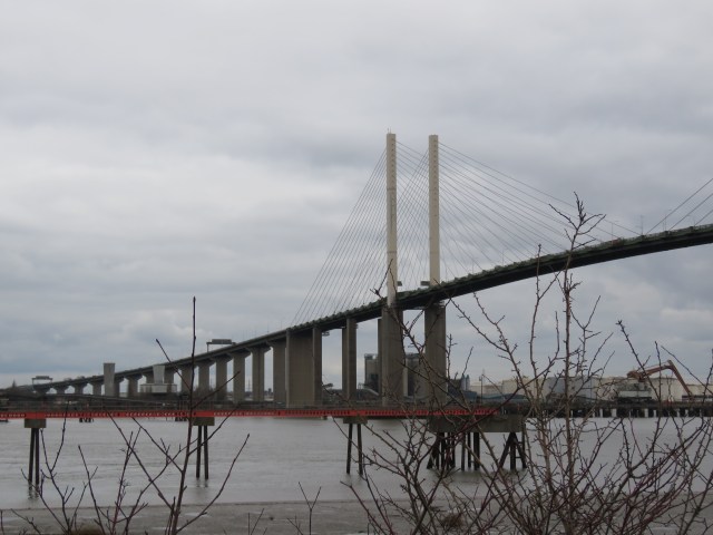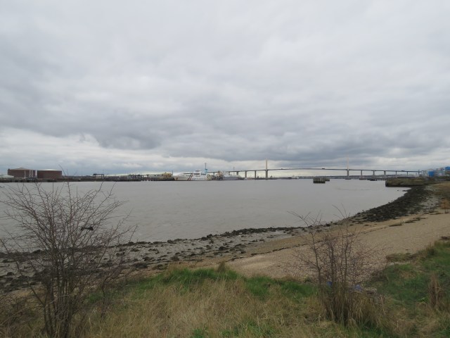From the mouth of the Darent it takes about half an hour to reach the bridge. On the opposite side is Purfleet and then Thurrock. The shore is lined with docks and visiting ships.