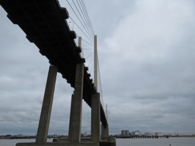 The bridge is part of the Dartford Crossing – there are also two tunnels. Except when there are high winds and the bridge is closed, the bridge is used for southbound traffic and the tunnels for northbound. The west tunnel opened in 1963, the east tunnel in 1980. The bridge began construction in 1988 and opened in 1991. The crossing connects the north and south sides of the London Orbital, the M25, via the A282. It is the only road crossing of the Thames east of Greater London and is heavily congested, even though it is a toll road. The bridge is a stunning piece of architecture. It’s a suspension bridge and was designed by a German civil engineer called Hellmut Homborg.