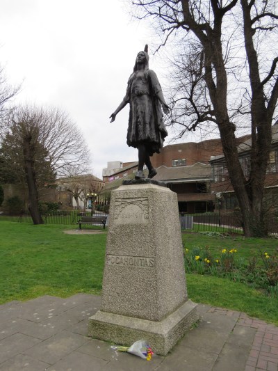 One of Gravesend’s oddest historical connections is that the renowned native American Pocahontas died there. Born in 1596, she was the daughter of a prominent chief, Powhatan, in what is now Virginia. She was captured and held for ransom by English colonists in 1613. She was encouraged to convert to Christianity and was baptised as Rebecca. She married a tobacco planter John Rolfe in 1614 and had a son, Thomas, in 1615. The Rolfes travelled to London in 1616 and she became a celebrity in English society. They set sail for Virginia in 1617 and stopped in Gravesend, where she died of unknown causes. She is buried in the grounds of St George’s church, in the centre of the town, although the exact location of the grave is not known today. There is a monument to her in the church grounds.