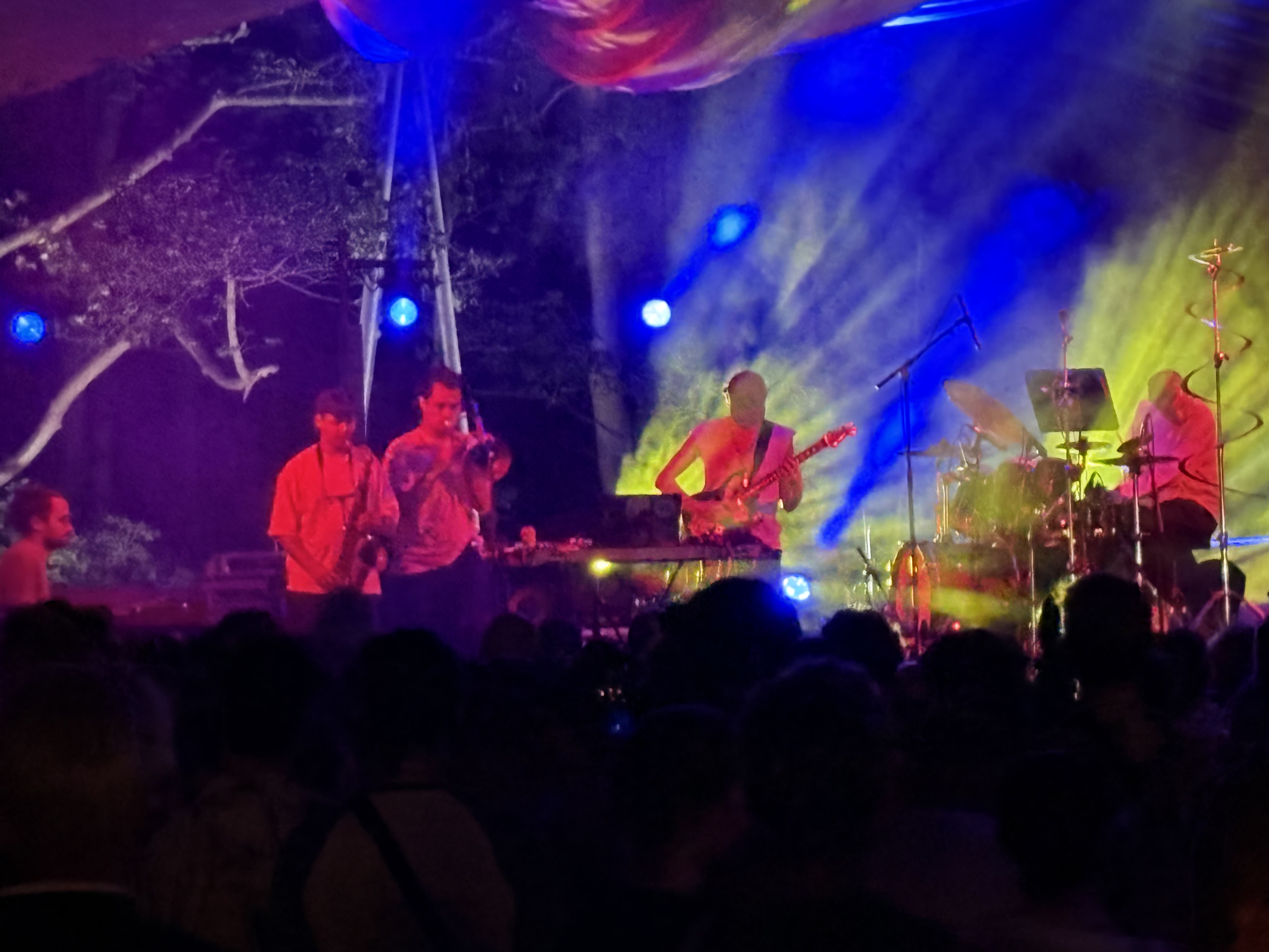 For the last act of the night, Jon and I were genuinely torn. Sting was headlining the Obelisk, and was bound to play a few Police classics, which would have been fun. But on the Sunrise, corto.alto were playing. They’re a Glasgow band, playing electronic jazz and more. Much more. Main man Liam Shortall is a multi-instrumentalist, and tonight he played guitar, trombone and keys. His band were all accomplished musicians. The music was a joy to listen to – and watch, with a colourful light show and the trees behind the stage lit up against the dark. The Sunrise is a magical place to be at night when the music is flowing. There was dub, there was jazz rock, with a soaring solo by the lead guitarist which took you back to John McLaughlin. Some scintillating sax, combining with the trombone. Modern jazz at its best. The highlight of the weekend, and an artist in Liam Shorthall to follow closely in the coming years. He’s playing Koko in Camden in October. We’ll be there.