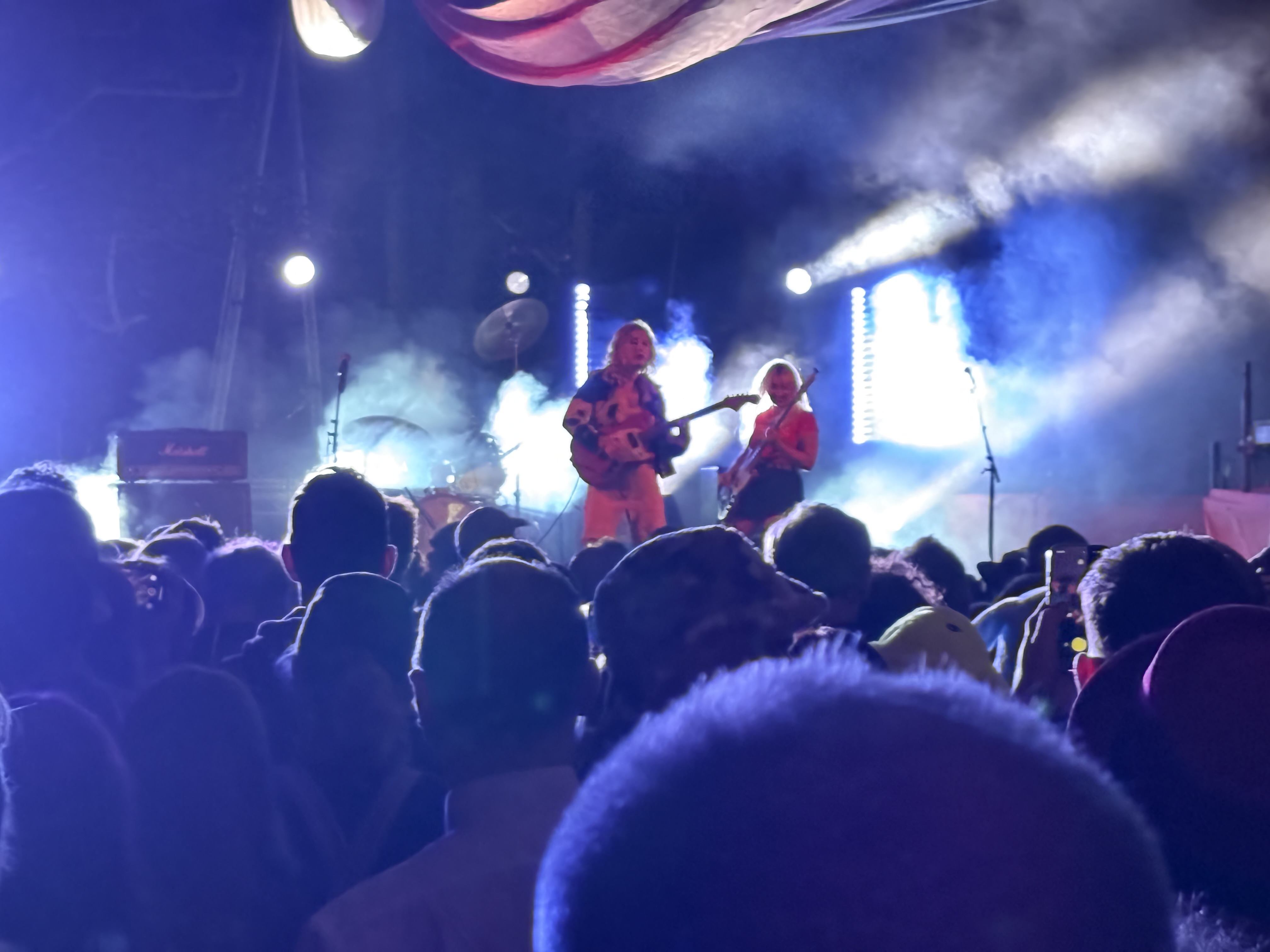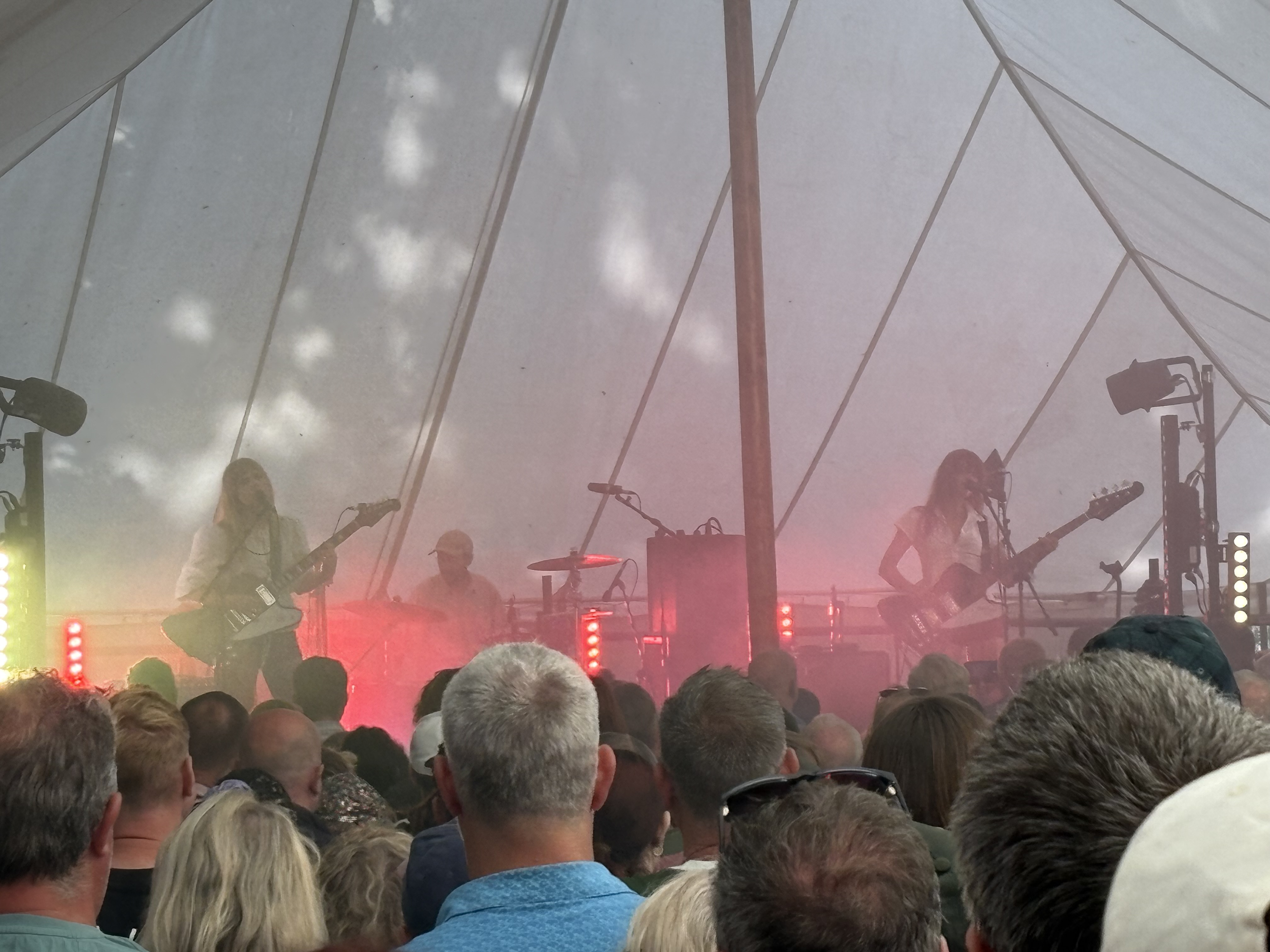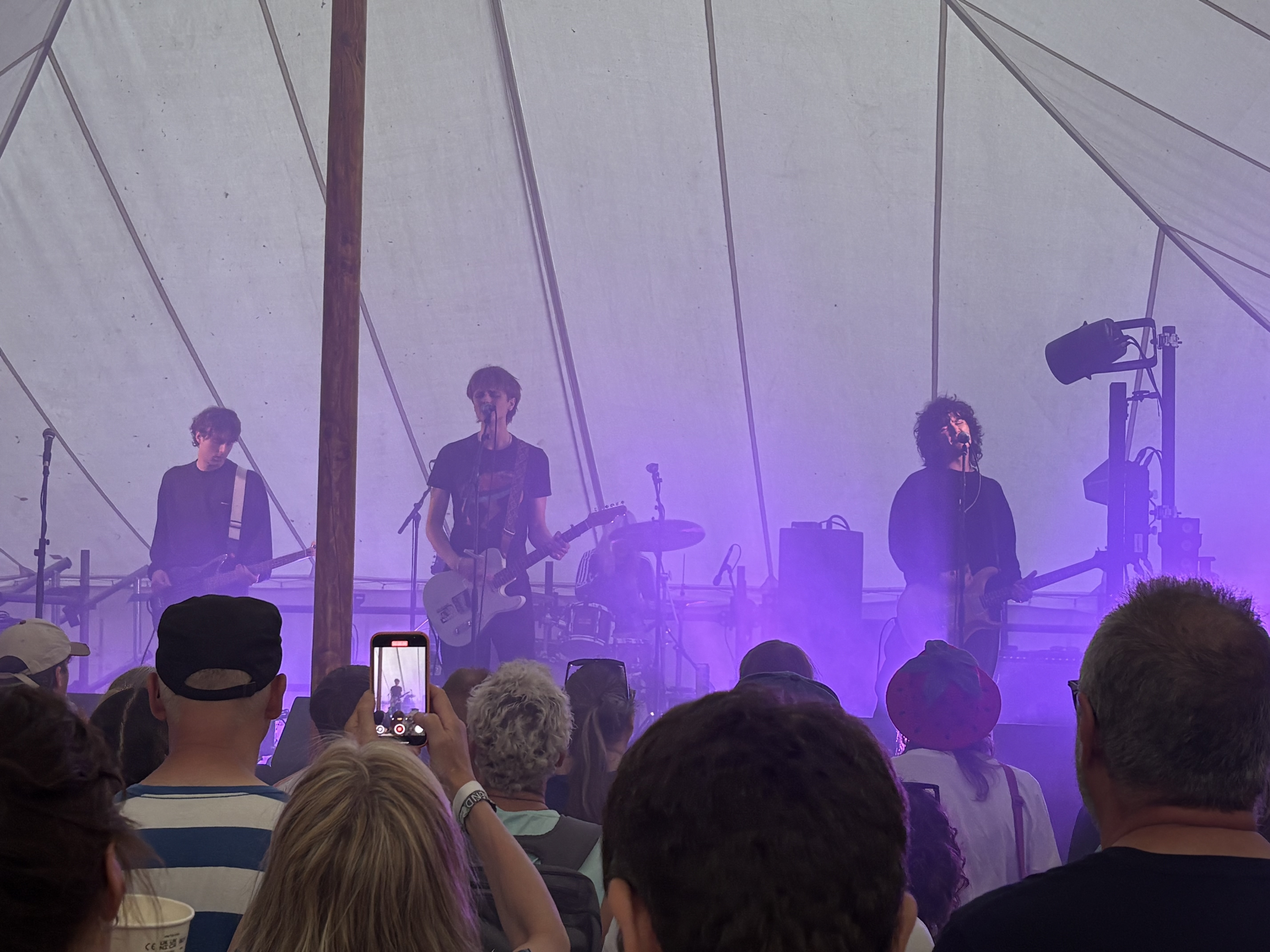 We stayed in the tent for the next show, Hamish Hawk. A Scottish singer who is well-respected and popular with the 20/30 year olds. I was expecting quite an Americana-based sound, as with Westside Cowboy. But Hamish and his band were a bit – can I use the word again? – bland. Nice, but not very exciting. We voted with our feet again and headed to the Alcove for the latest big thing from the Isle of Wight – oh yes! – The Pill. Two women with guitars and witty lyrics mostly dissing men. Familiar? Yes, the Alcove was heaving, hoping for the next Wet Leg. And they were good, rockier than Wet Leg – more Ramones than the Strokes. A little samey over the course of the 35 minutes, but fun.