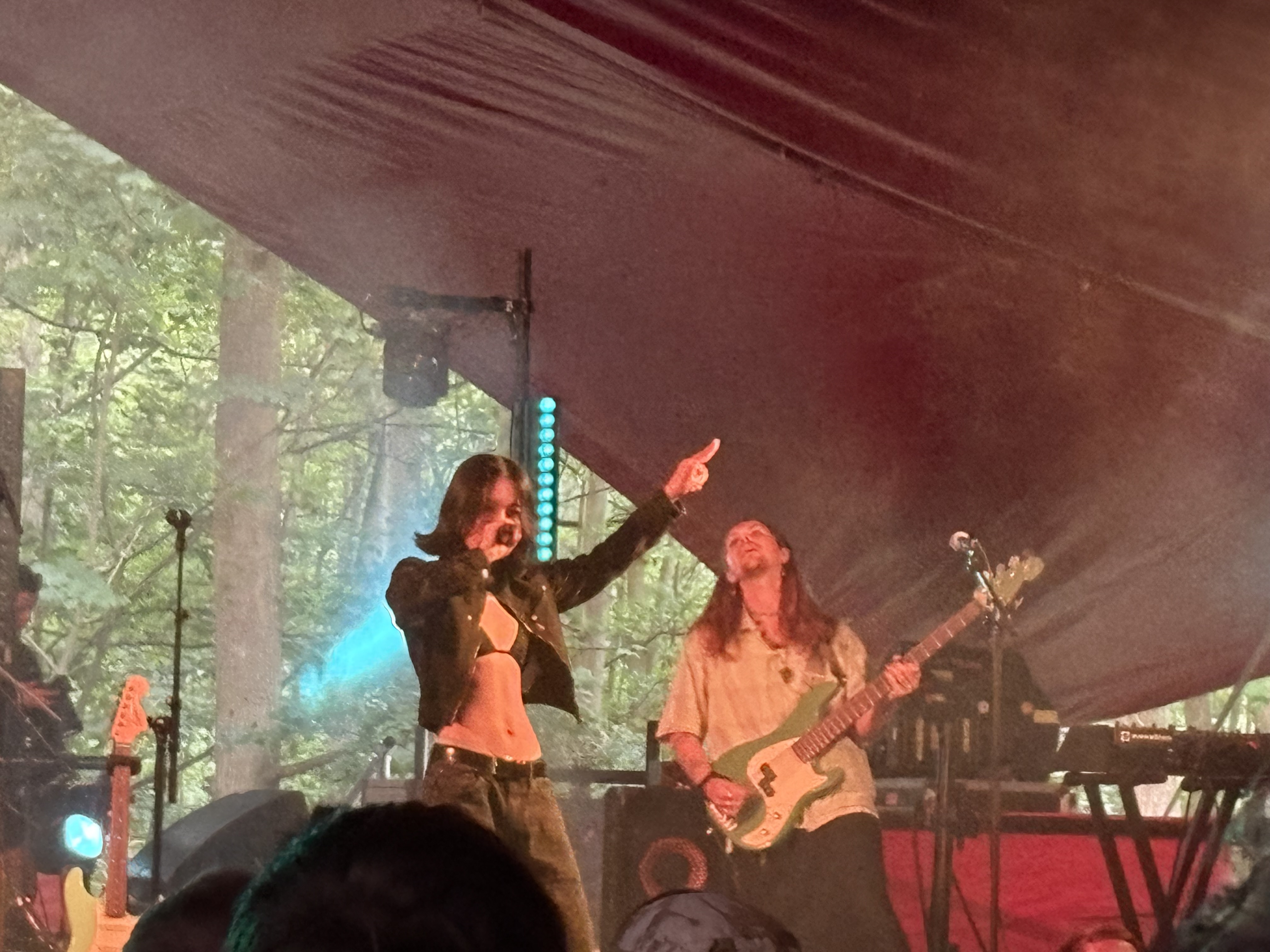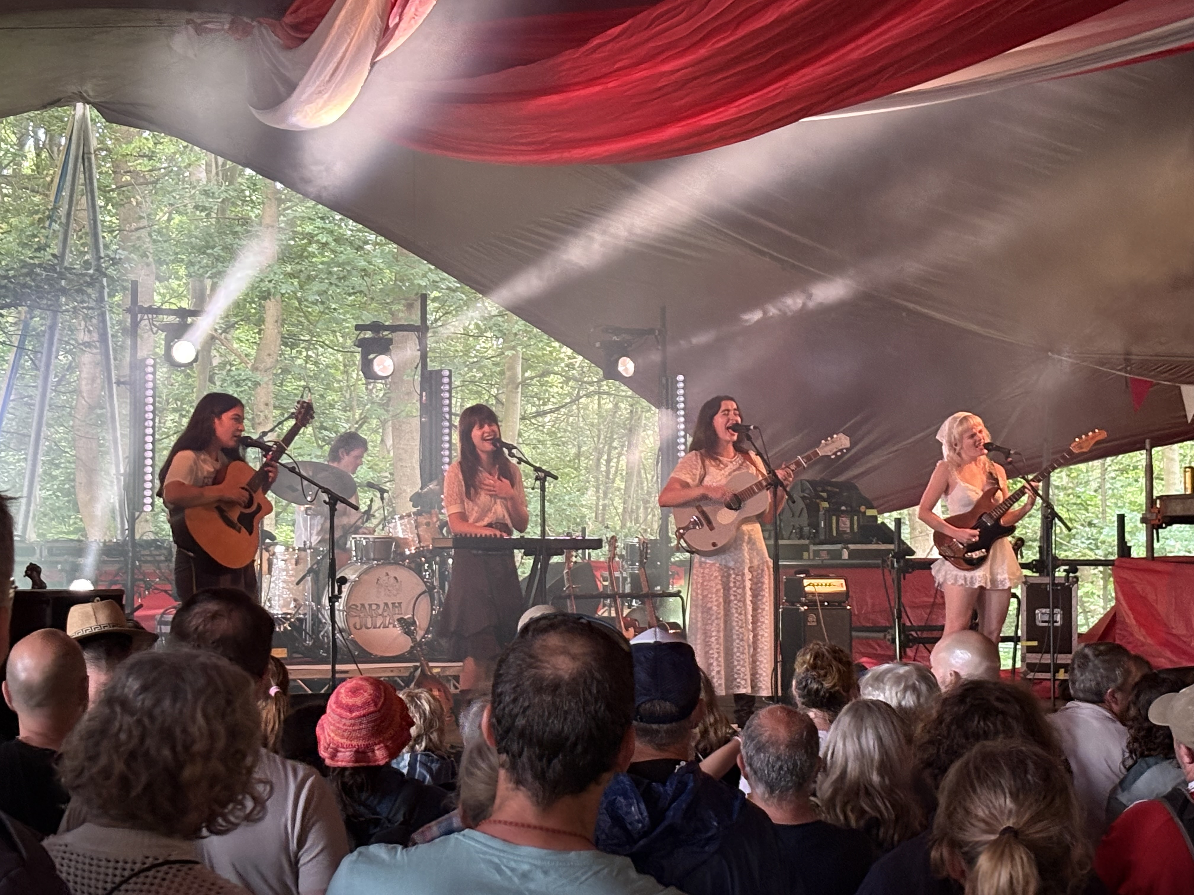 We stayed at the Sunrise for Silver Gore, who the blurb labelled as alt-rockers. The band name made them sound interesting. The music wasn’t though and we went after a couple of songs. We tried Demae at the Alcove. I’ve heard her soul-dance on 6 Music before and liked it. Trouble was, not many people came along and a sound that would be dazzling in a London club didn’t quite work in the Alcove. Credit to her and her musical partner for giving it their all though. We stayed for a few songs then parted company. I went back into the woods and spent a while at the Lavish Lounge – complete with an array of leather sofas in the open air – having a cup of tea and watching a singer called Claudia Kate, who was rocking. Then it was back to the Sunrise for Sara Julia. They are two sisters from Amsterdam with a backing band. They sing beautiful harmonies rather in the manner of our very own Staves. It’s hard to avoid the comparison, though Sara Julia had a bit more of a rock sound. I really enjoyed the show – another one to follow up.