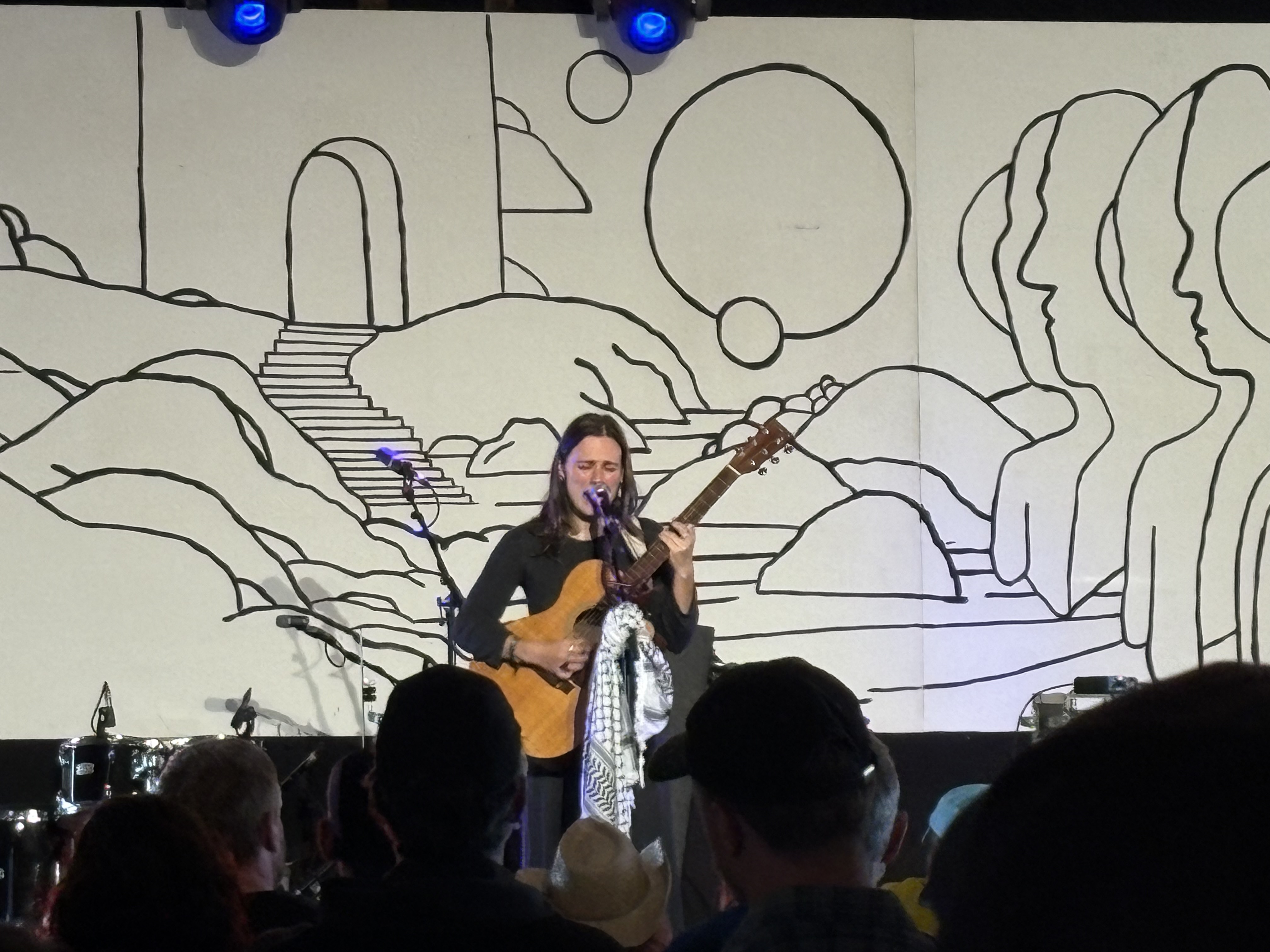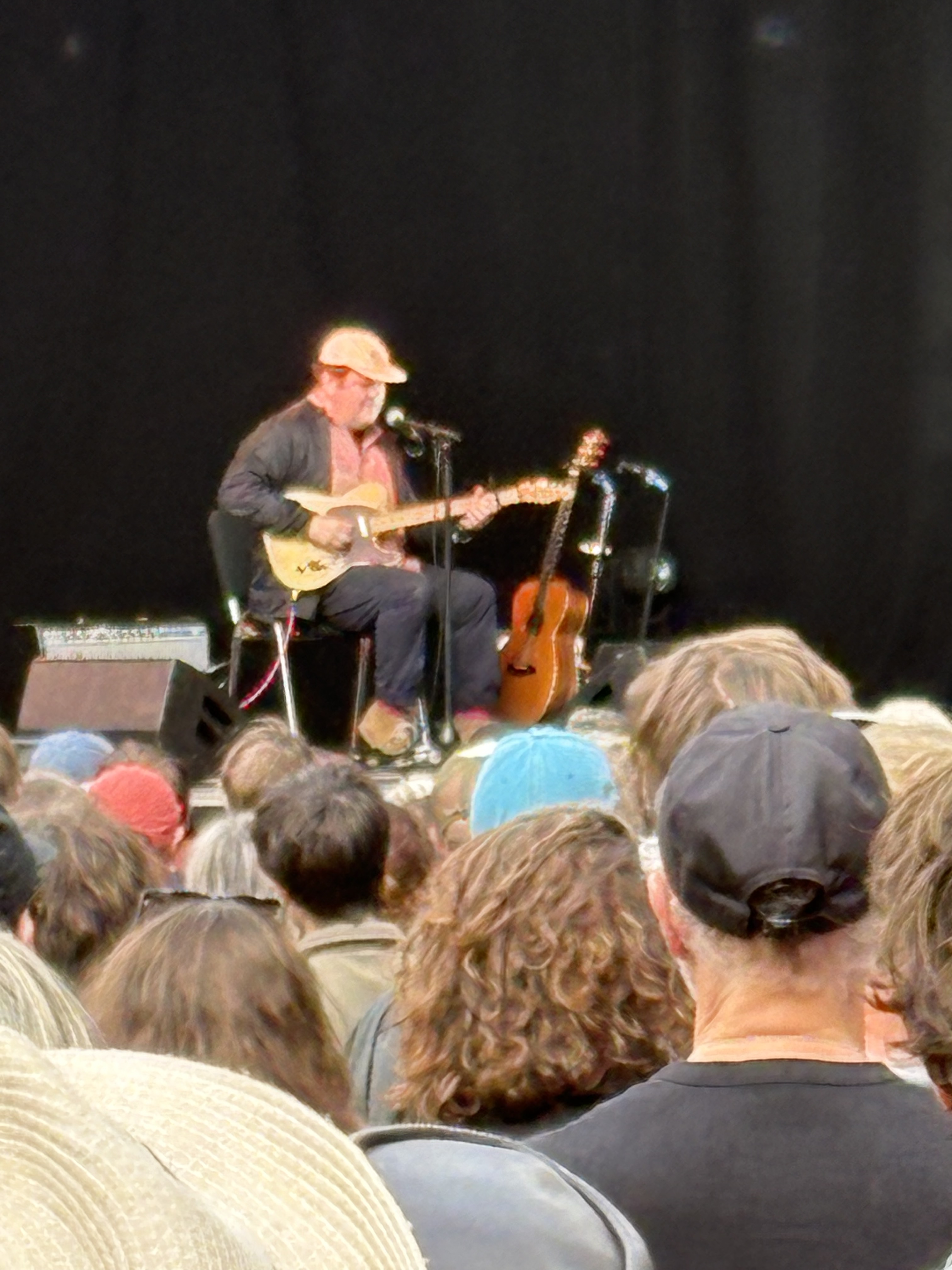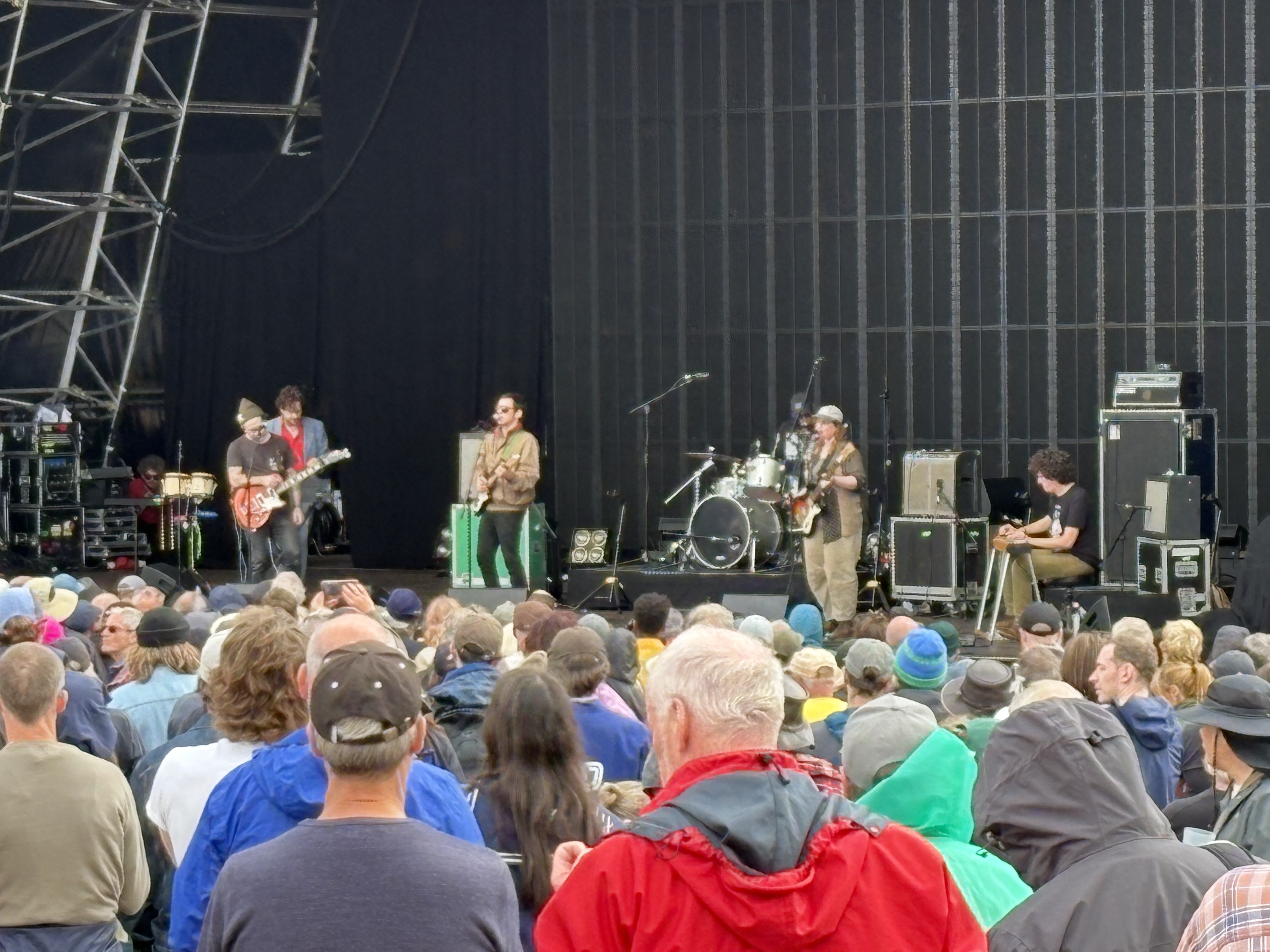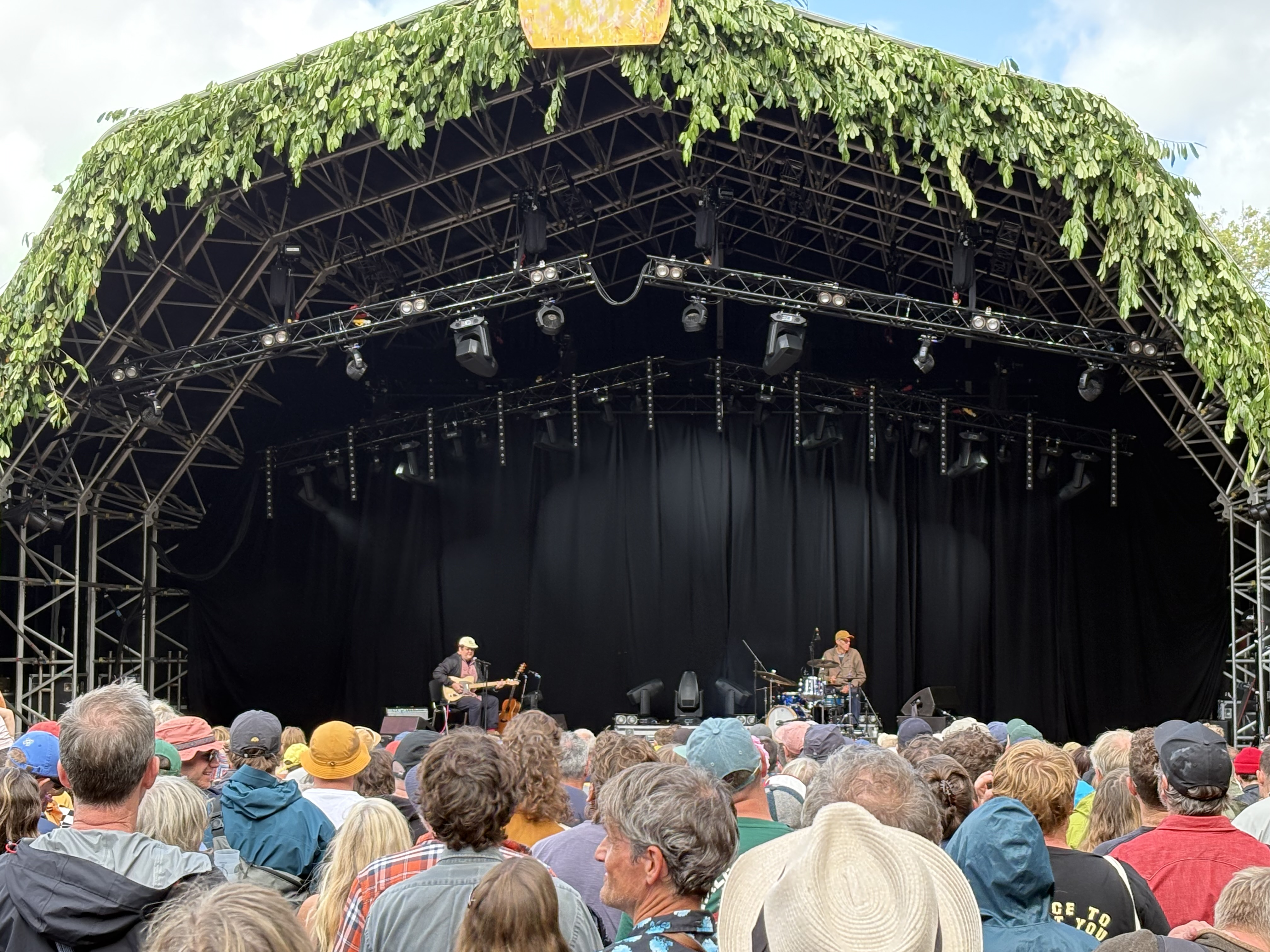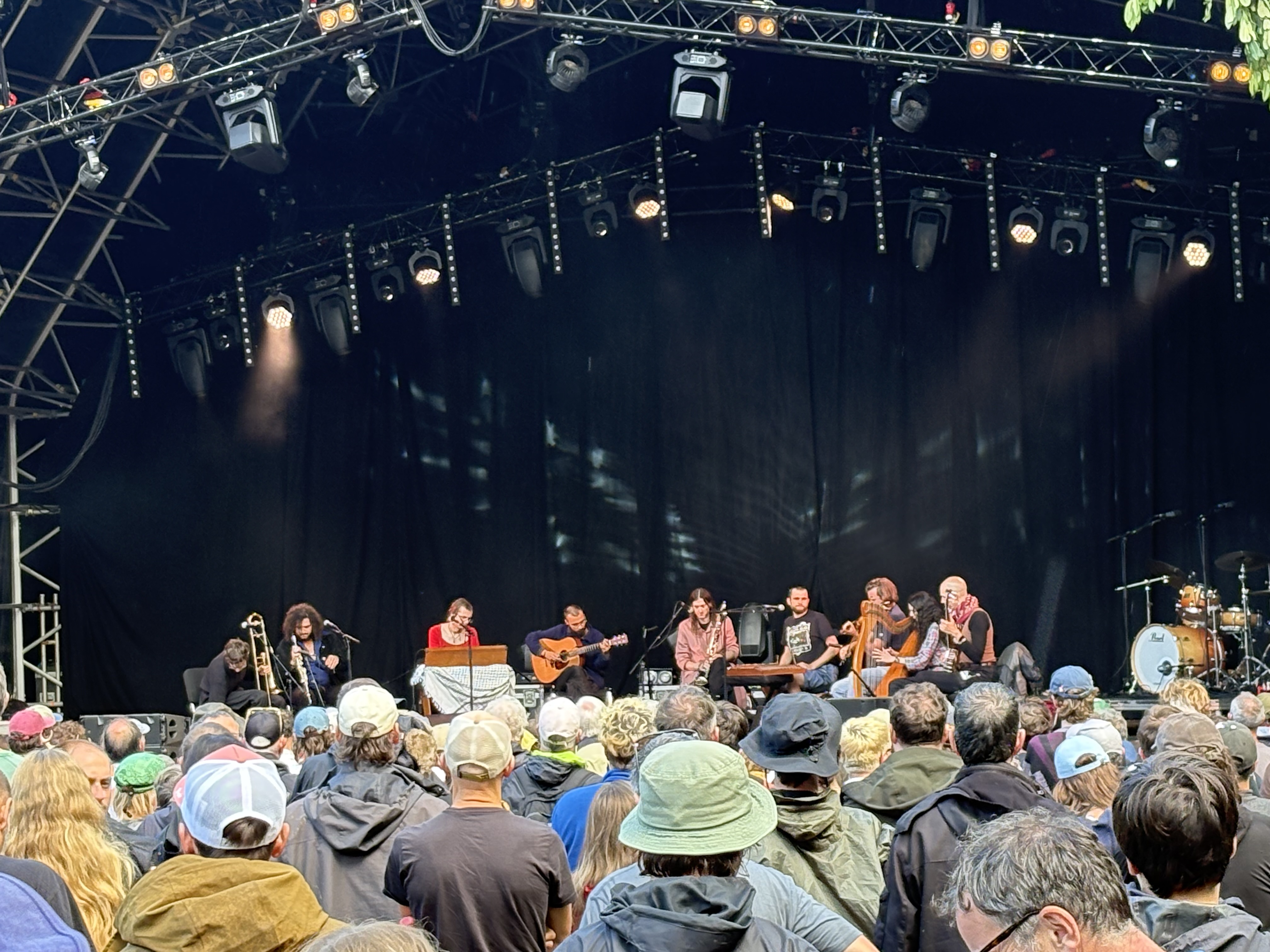 Next was Floodlights, an Australian band described as post-punk and political in the programme. In the event, it sounded to me like pretty orthodox rock and I couldn’t tell what they were singing about. But it was alright. After that Shane and I wandered up to the Garden Stage to see American folk singer Jake Xerxes Fussell. I saw him on the same stage in 2022 and he was a revelation, as he mined the traditional American songbook. This time was just as good – more modern, perhaps, with a gently flowing electric guitar sound as much as acoustic. There were elements of say, JJ Cale in his playing, and he had that ability to lay down two or three rhythms at the same time – without a loop machine. He was accompanied by some subtle drumming for the majority of the songs. Once again, I felt moved by the sheer quality of it all. Jake is a modest character but performs with an obvious love for the songs. l was delighted too when he played Nick Lowe’s I Love the Sound of Breaking Glass in a country style. Not a cover you would have expected, but it worked really well. Maybe it was always a country song at heart.