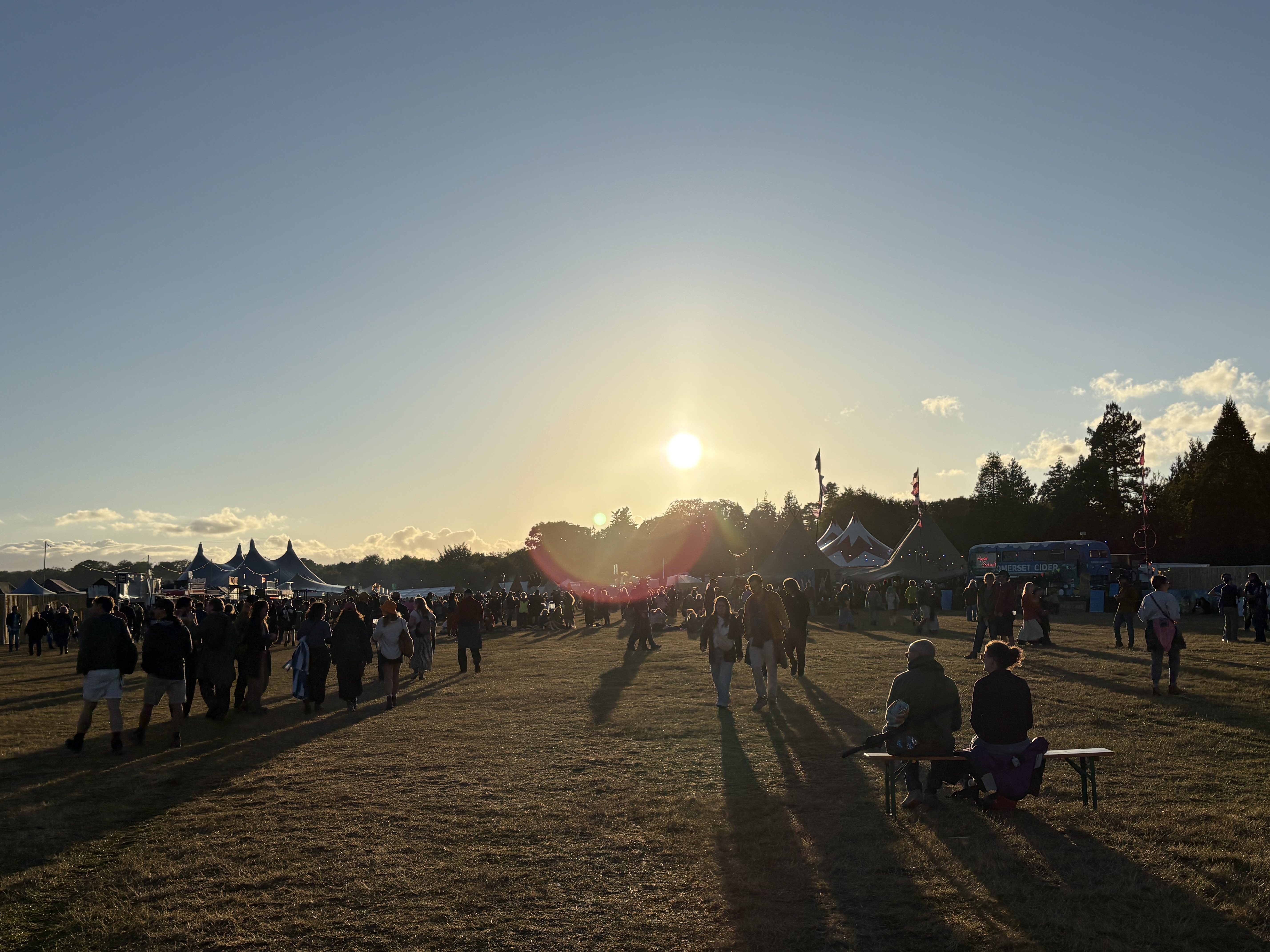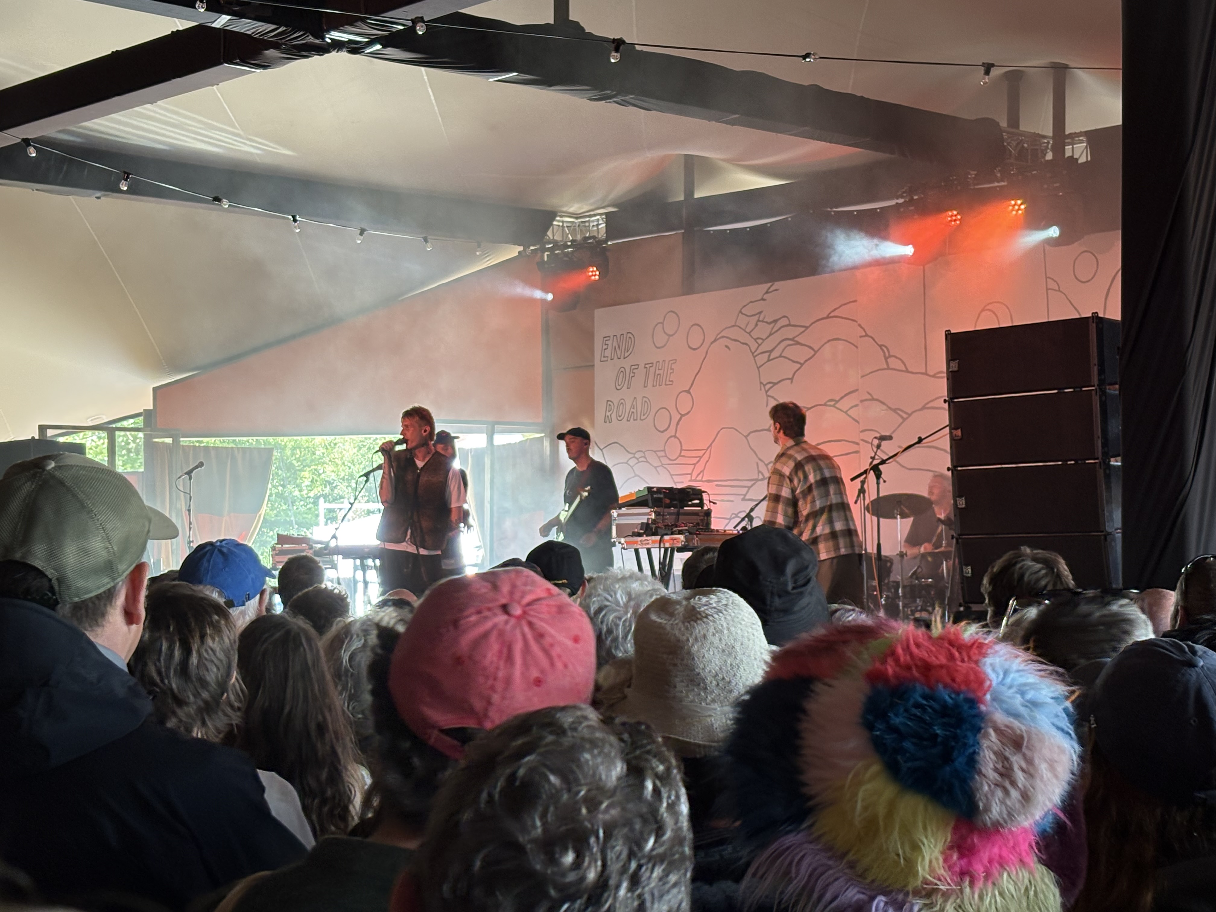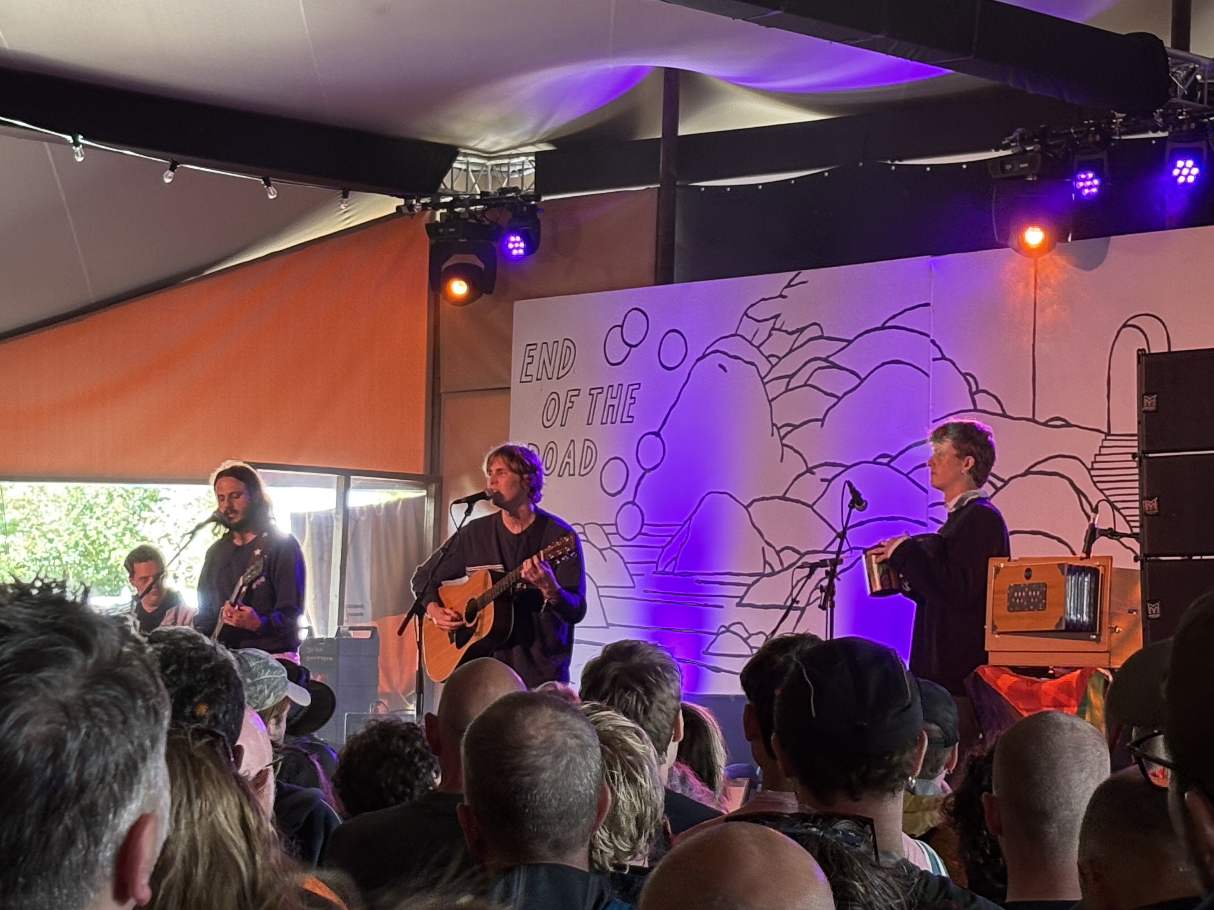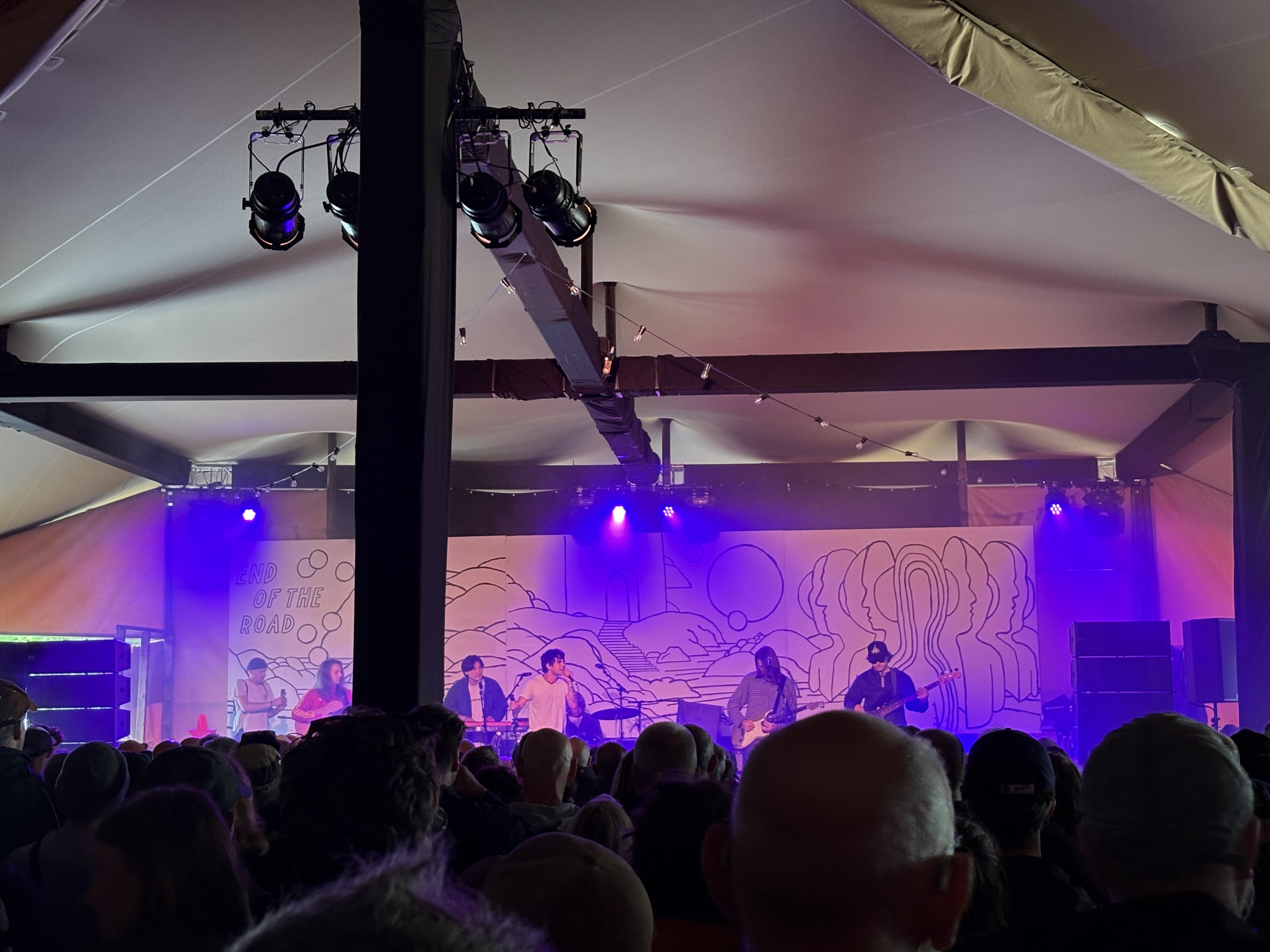 And so we came to the last show of the festival – for us, anyway. Black Country New Road on the Garden Stage. Father John Misty was headlining the Woods Stage. I like his music well enough, but an hour and three quarters would have been an endurance test. BCNR were a concise hour and a quarter. The place took a while to fill up and we found ourselves quite close to the front, on the right hand side. A perfect viewing position. BCNR are constantly evolving musically and I hadn’t listened properly to their latest album, so the music was all new to me. But it didn’t matter, because their invention and musicianship is so good that you get completely engrossed in it. The weather was dry, the night was still, the lights illuminated the stage and shone into the darkness, and the music was sublime. It’s ever more prog – not bombastic, but like the gentler sounds of Genesis in the early 70s. The singing was mostly by bassist Tyler Hyde and keyboard player May Kershaw. Georgia Ellery – she of Jockstrap fame – kept a fairly low profile at the side, playing violin and singing quite sparingly. A team effort, and really captivating. Even when they all got their recorders out at the end and formed a circle it was good! It was like nothing else I’d heard all weekend, and yet the perfect ending, an encapsulation of all that is good about End of the Road.