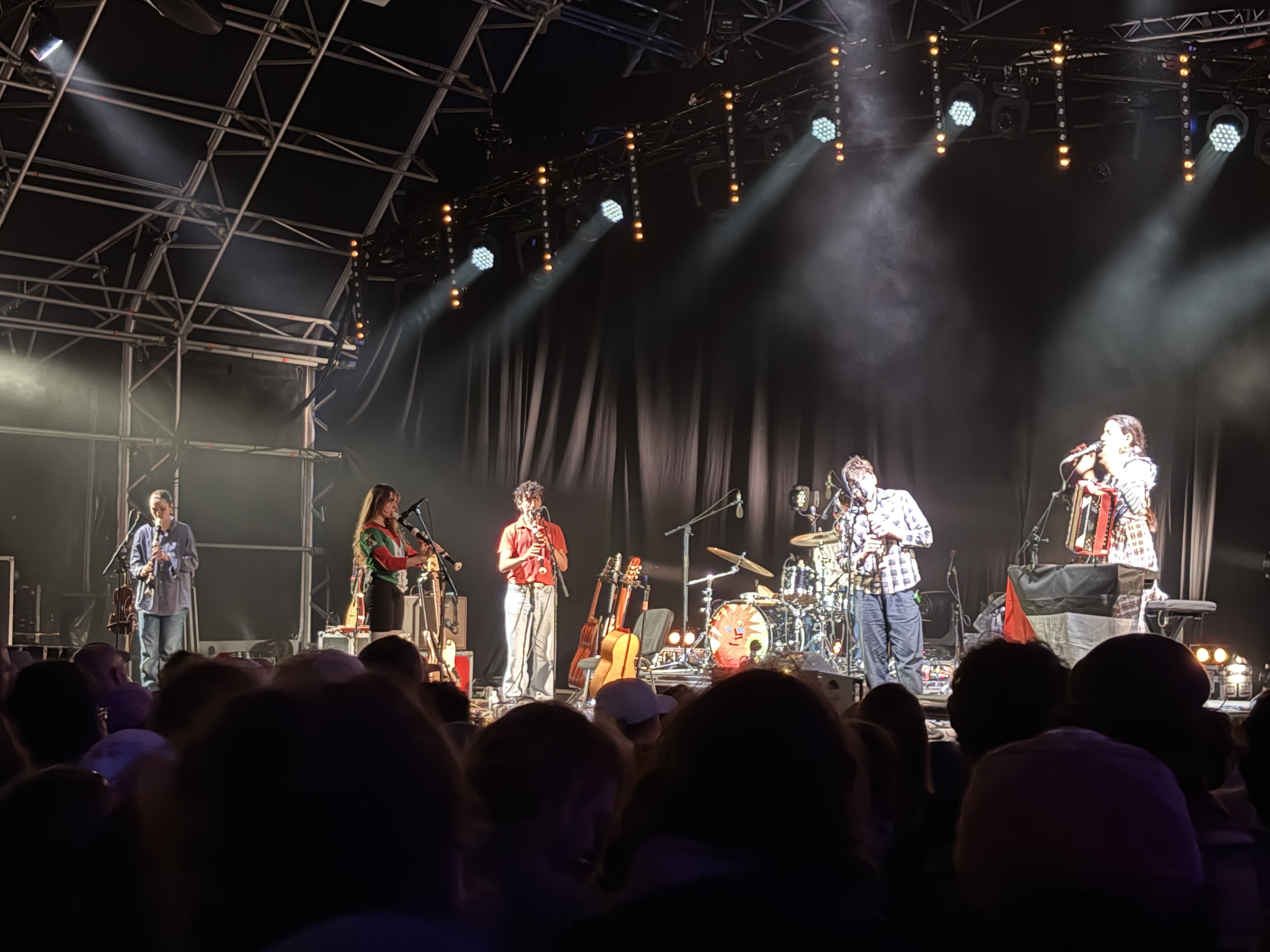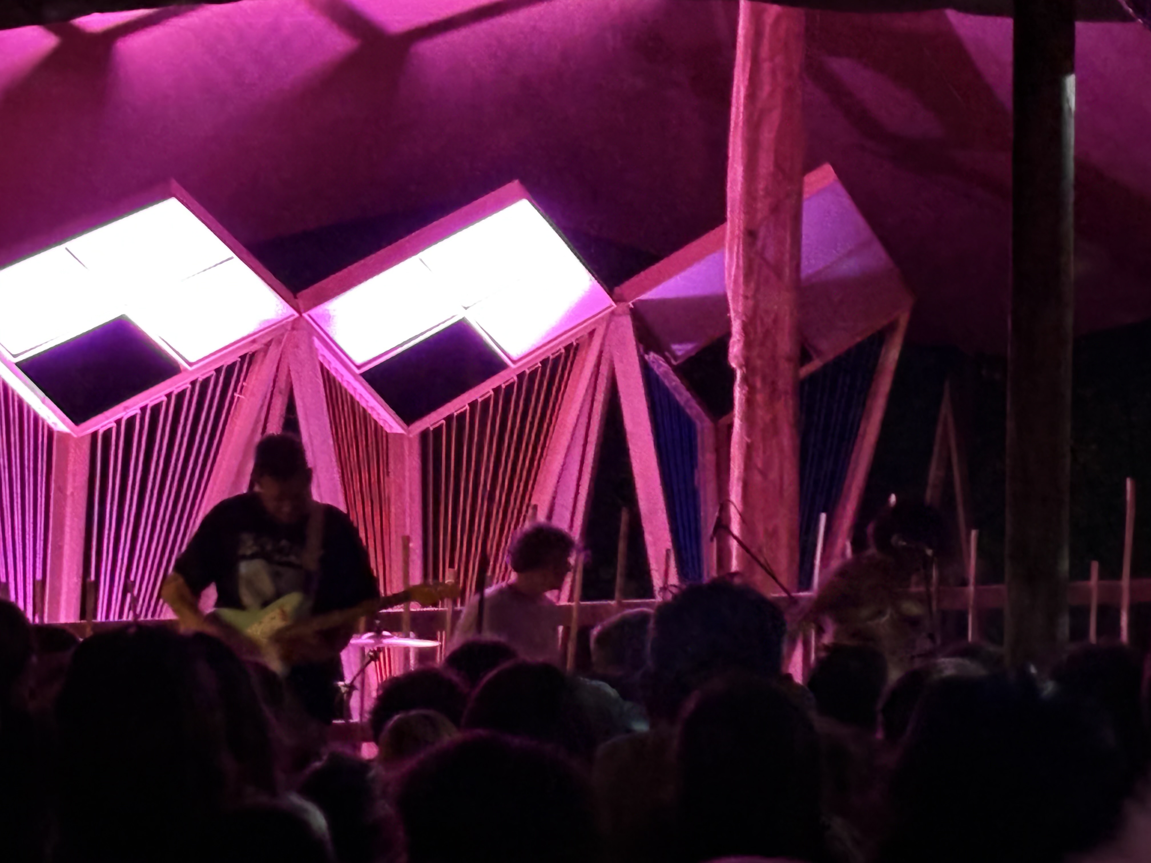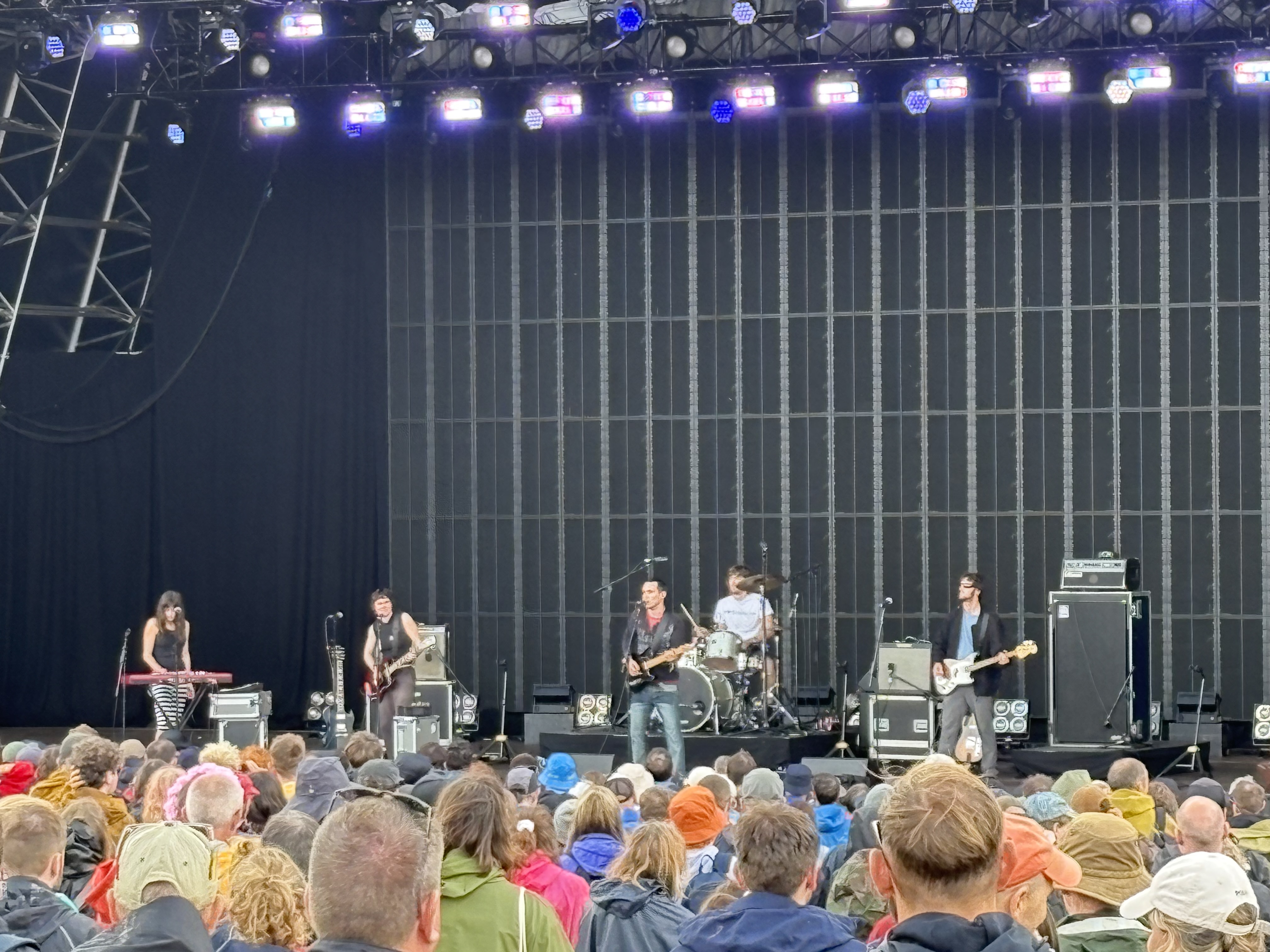 We started with our favourite modern shoegaze band bdrmm in a very busy and steamy Folly tent. They put on a lively and rather joyful show – much more expressive than when we saw them at the Scala in November 2023. I haven’t listened to the 2025 album Microtonic yet, but the reviews suggest that it’s more electronic and upbeat than previous efforts. That showed in tonight’s performance.