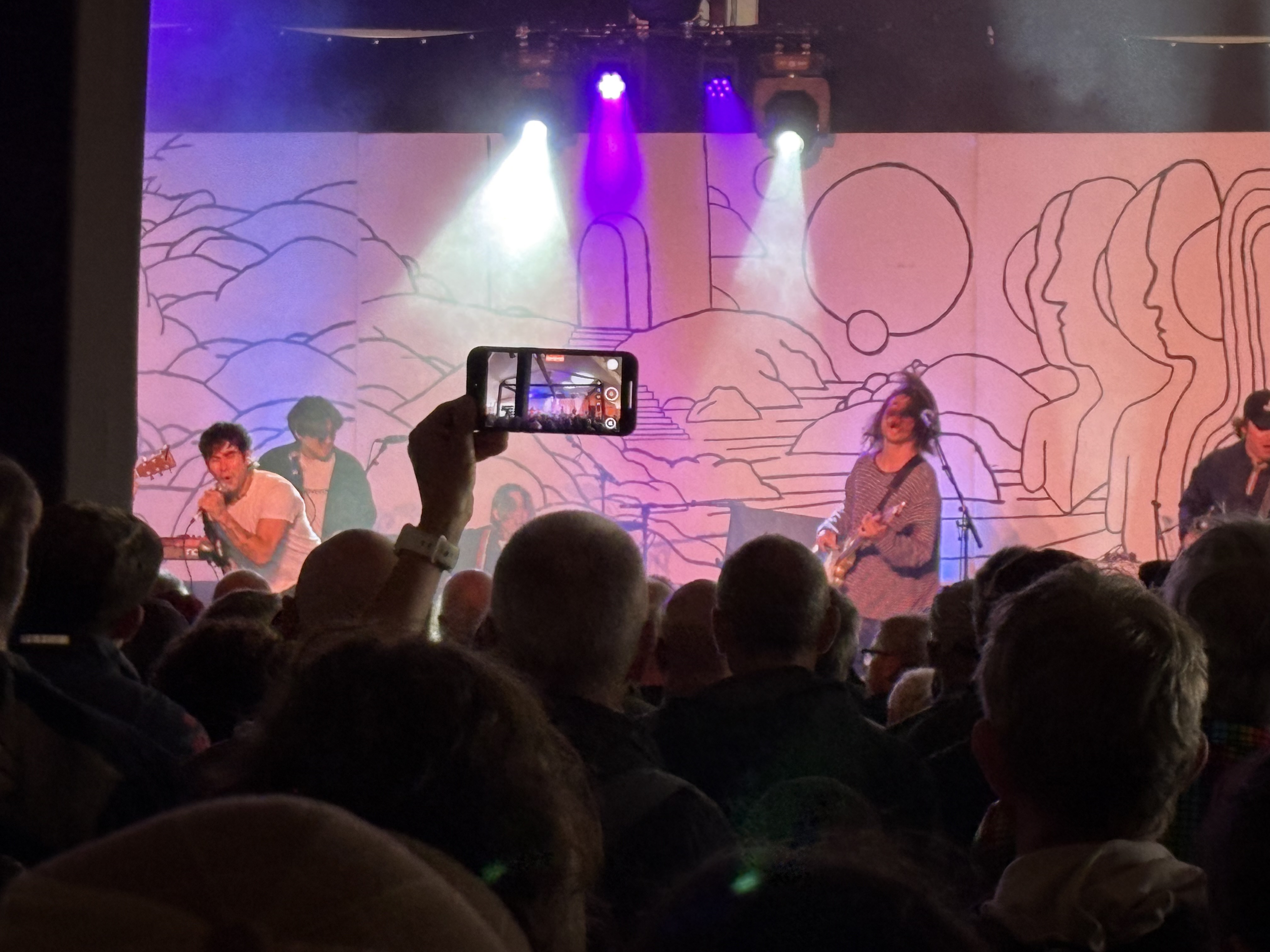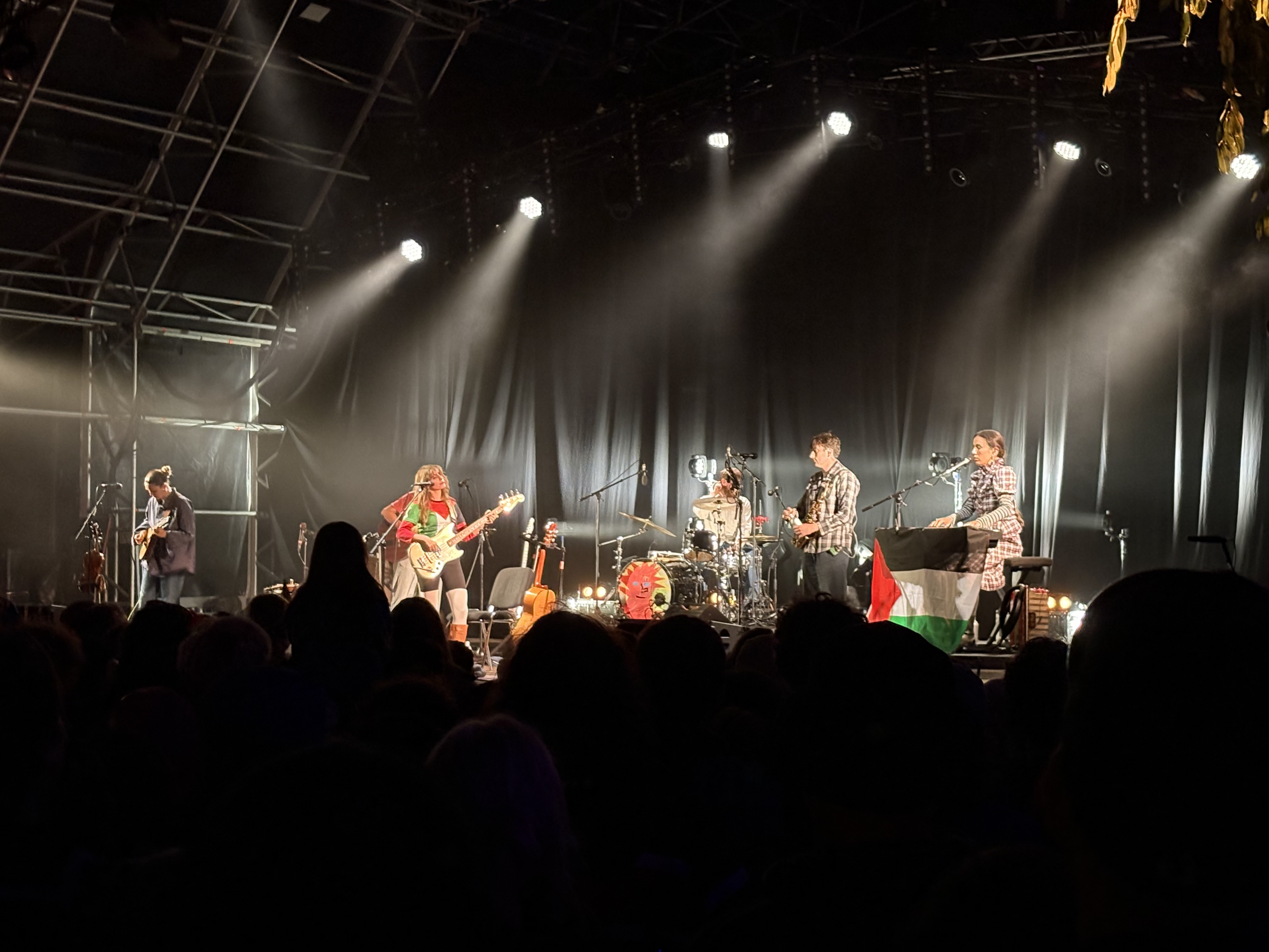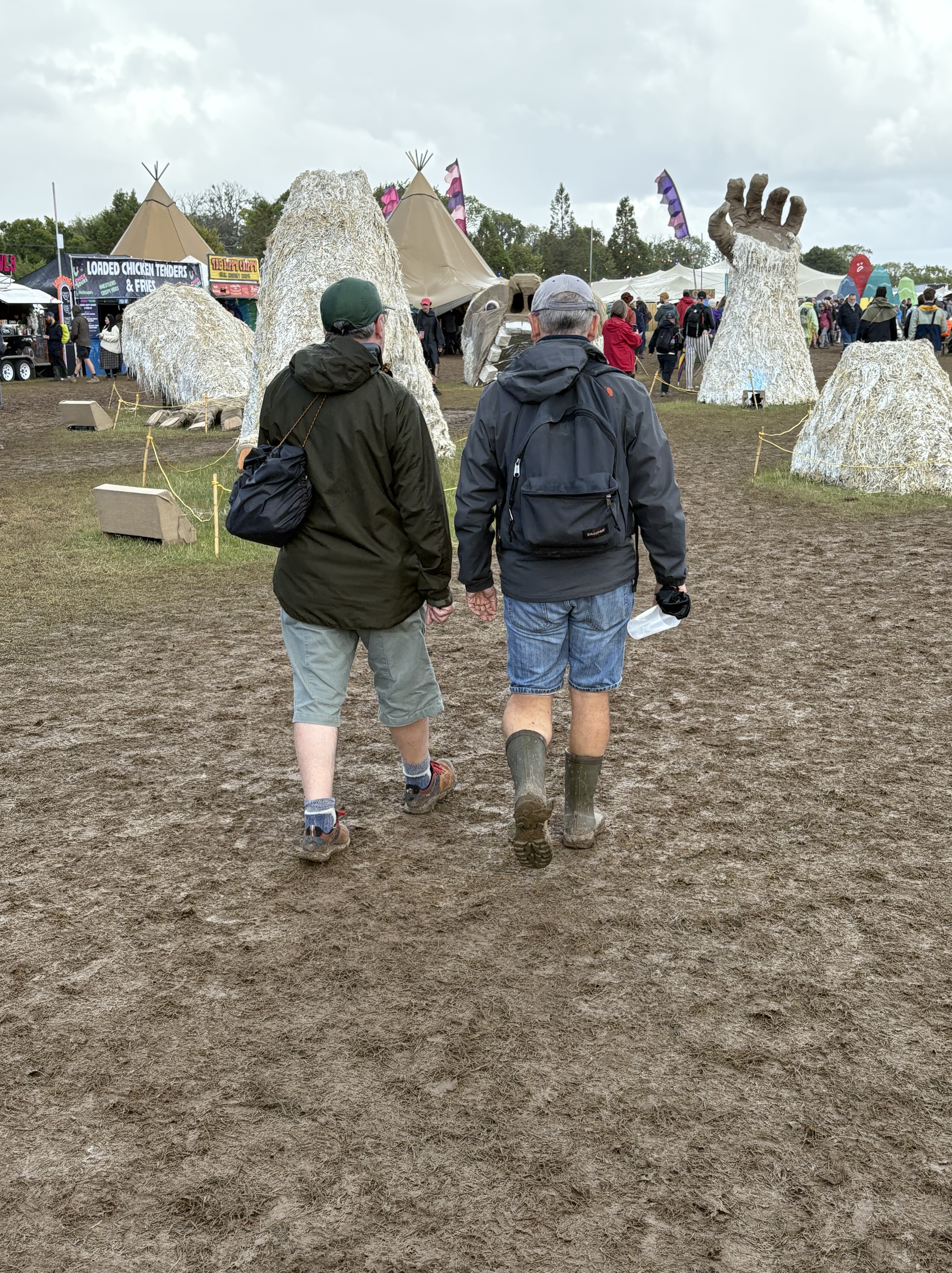 That left us with a choice of headliners: Self Esteem on the Woods stage or Viagra Boys on the Garden stage. We opted for the latter – the attraction of some straightforward rocking and a more sheltered space, just in case the rain returned. I’m not a huge fan of Viagra Boys, who hail from Sweden, but Louis and his friends are, and they were somewhere near the front, I assume. Shane, Jon and I stayed at the back, near the bar and enjoyed the show, which was as rumbustious as expected, with a wailing sax adding an extra dimension to the sound. The singer had some amusing patter in between songs and, more seriously, announced that the band were donating their appearance fee to Doctors without Borders, in Palestine. Unsurprisingly there were quite a few gestures of support for Palestine during the weekend – credit to the Viagra Boys for giving theirs some substance.